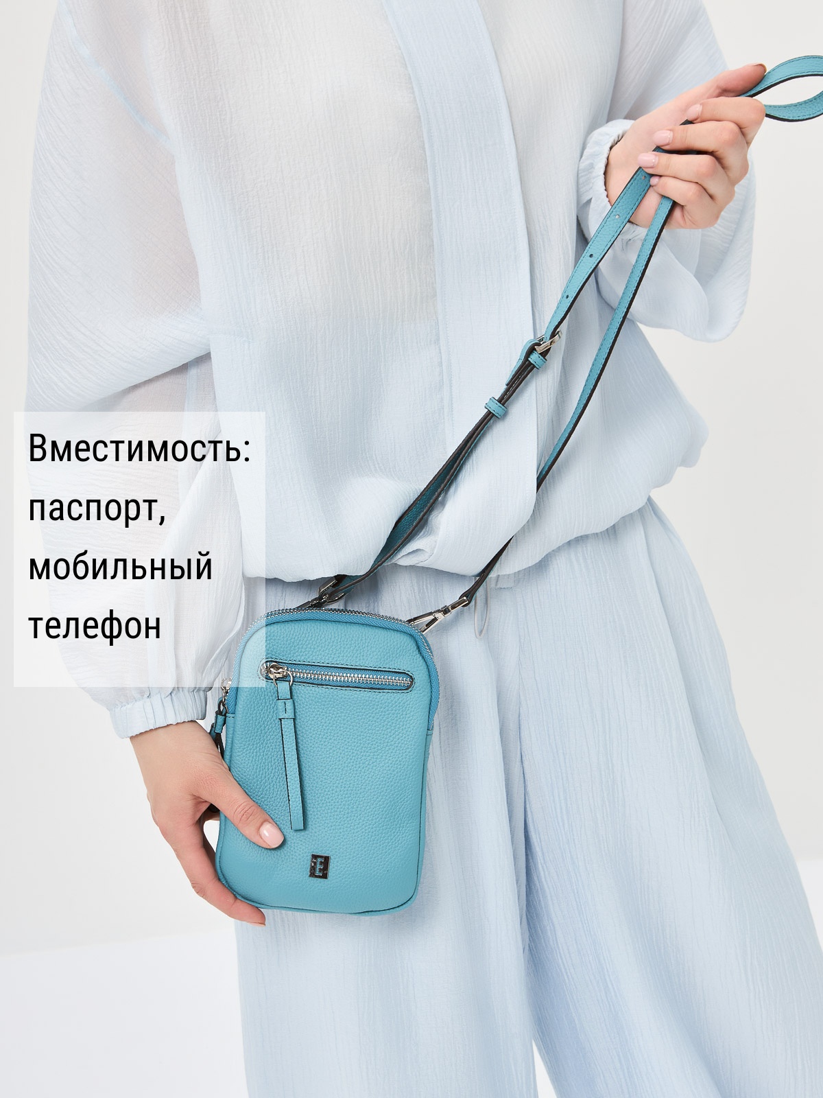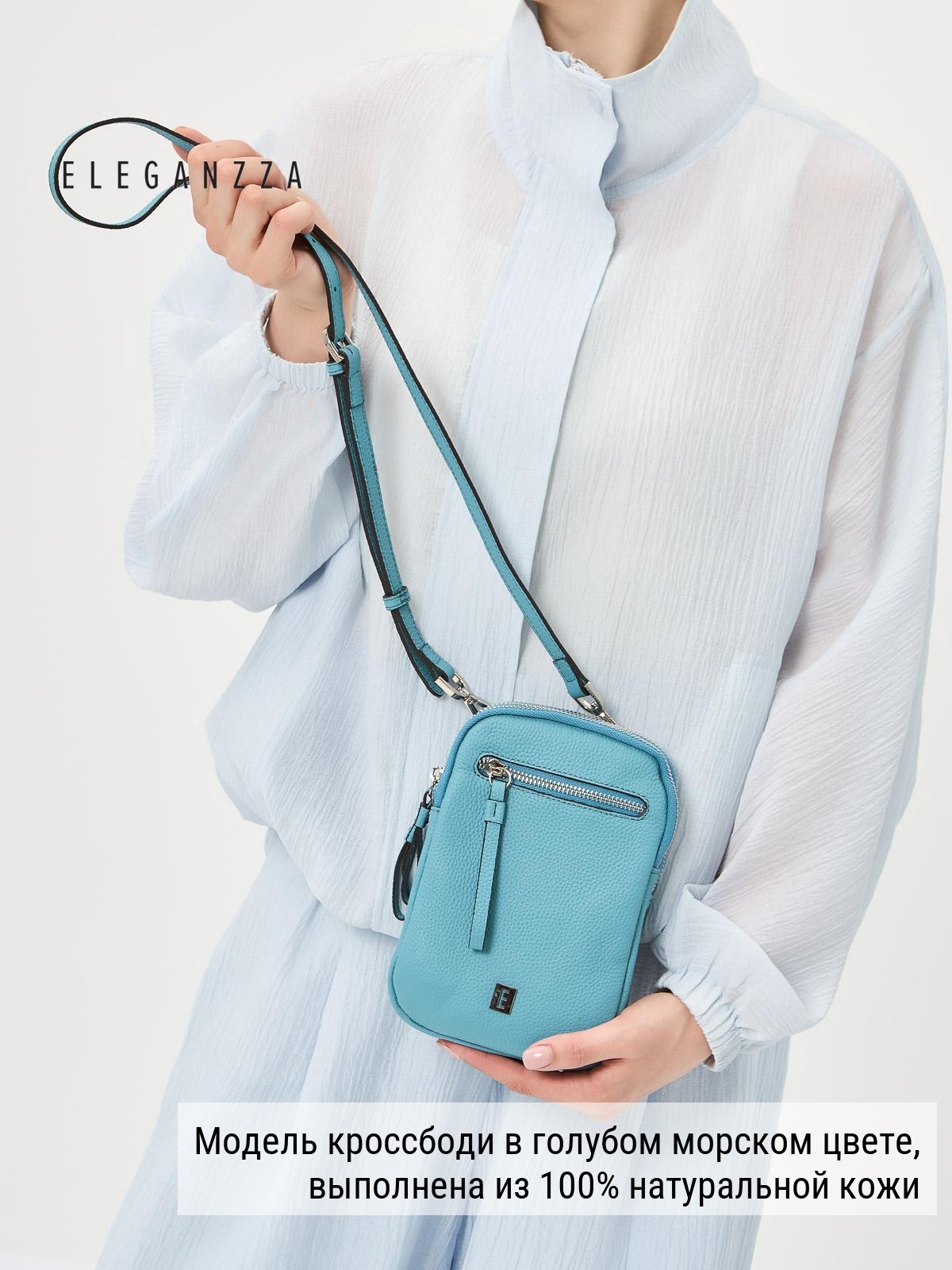 Женская сумка торговой марки Eleganzza из натуральной кожи. Модель имеет два самостоятельных отделения которые закрываются на металлические молнии. Внутри переднего отделения - открытый карман. Внутри заднего отделения - четыре отделения для пластиковых карт. На передней стенке - карман на молнии. Длина наплечного съёмного ремня из натуральной кожи - 110 см. ширина - 14 см. Модель не имеет ножки на дне.