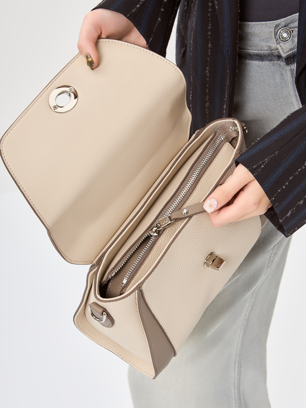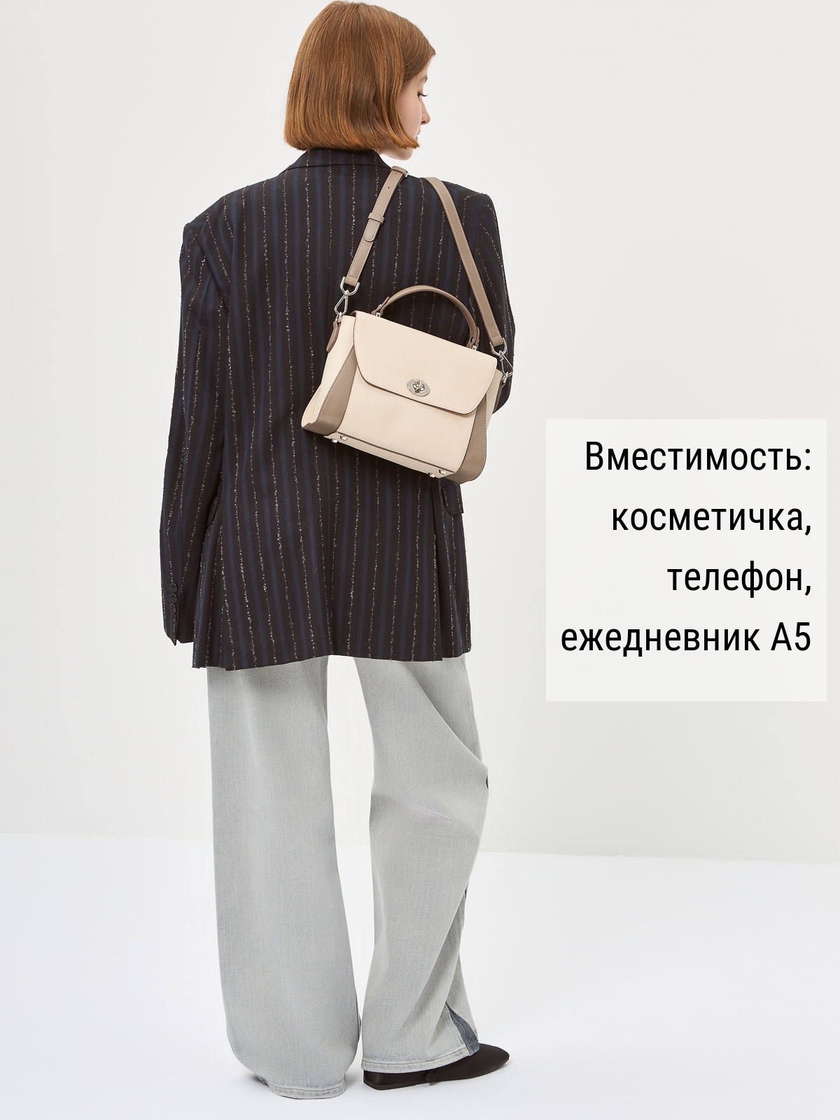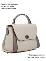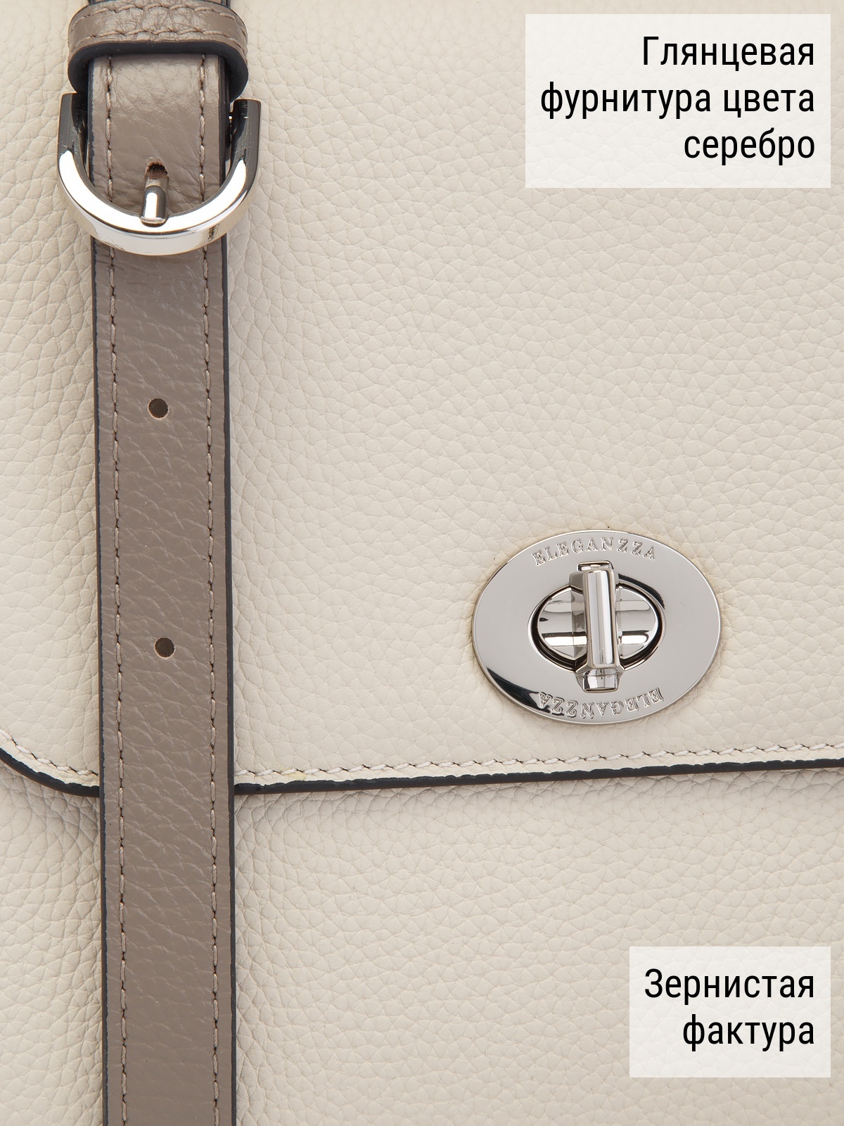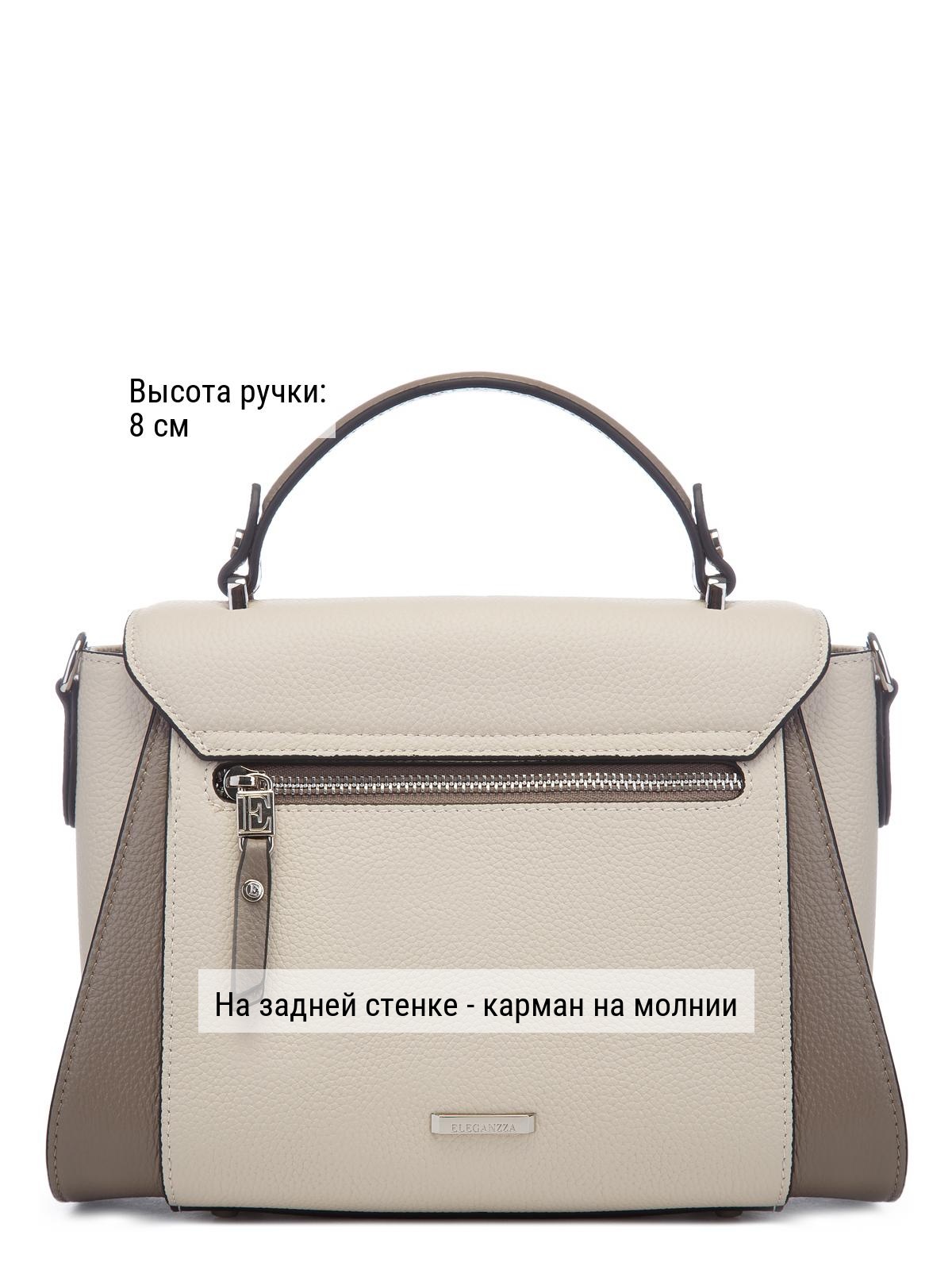 Женская сумка торговой марки Eleganzza из натуральной кожи. Модель закрывается на клапан с поворотным замком и металлическую молнию. Внутри одно отделение с карманом на молнии и двумя открытыми карманами. На задней стенке - карман на молнии. Высота ручки - 8 см. Длина наплечного ремня из натуральной кожи - 118 см. ширина - 17 см. Модель имеет ножки на дне. Не вмещает формат А4.