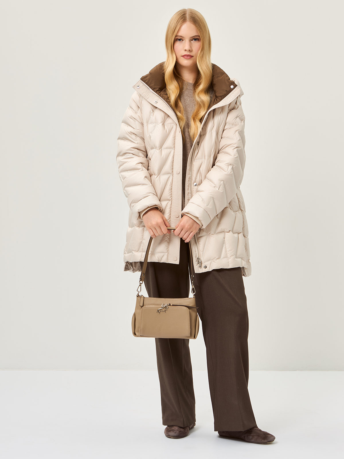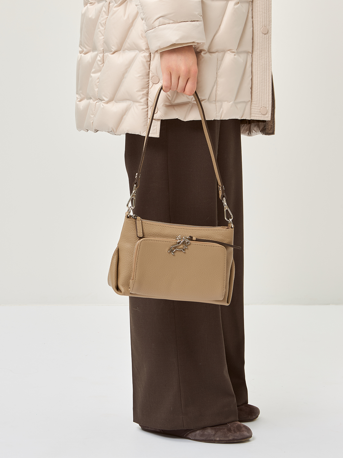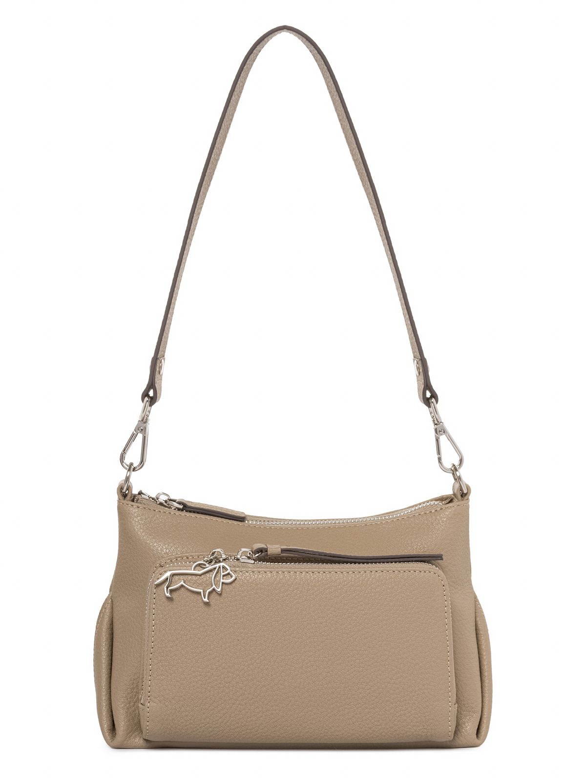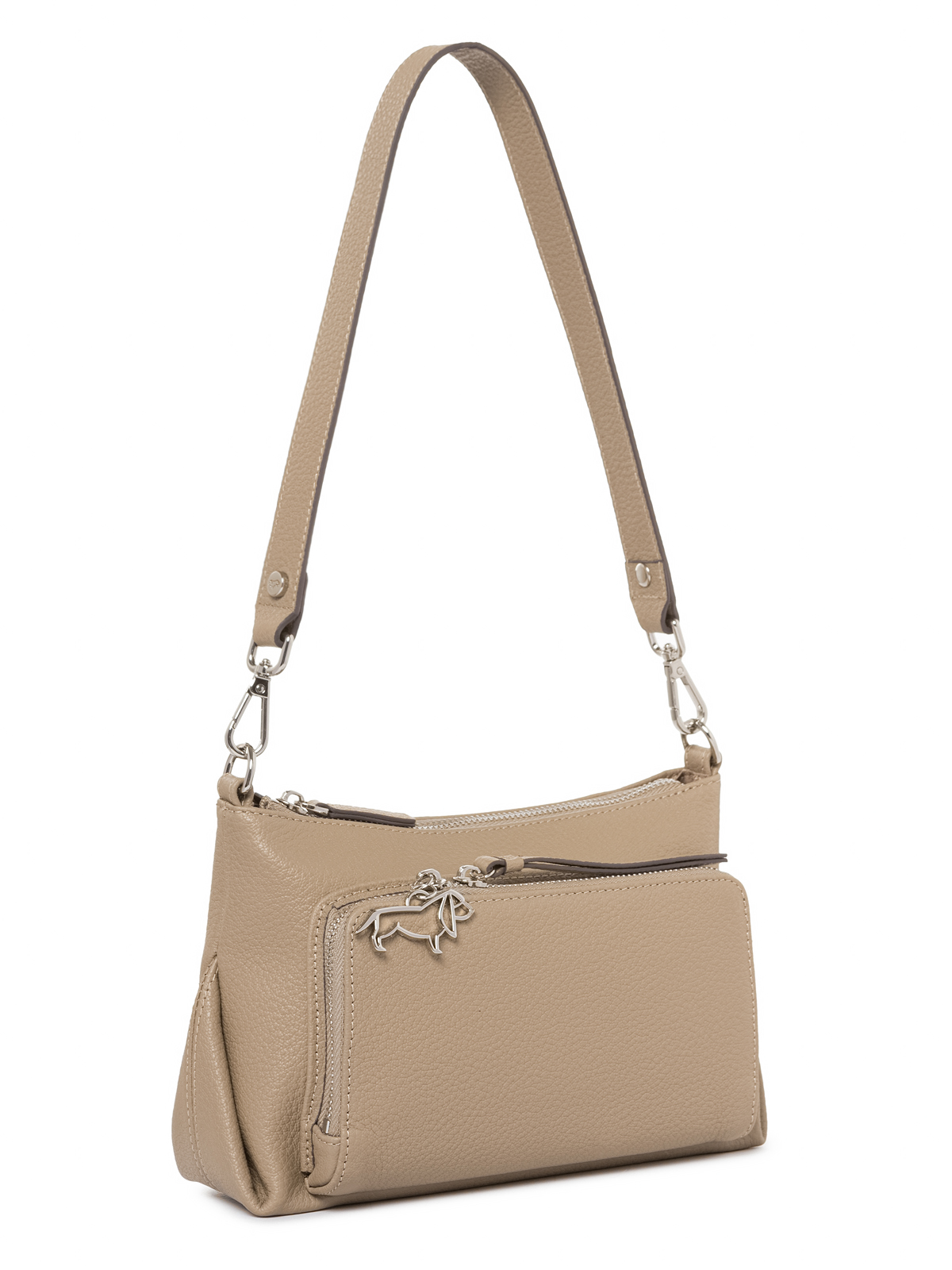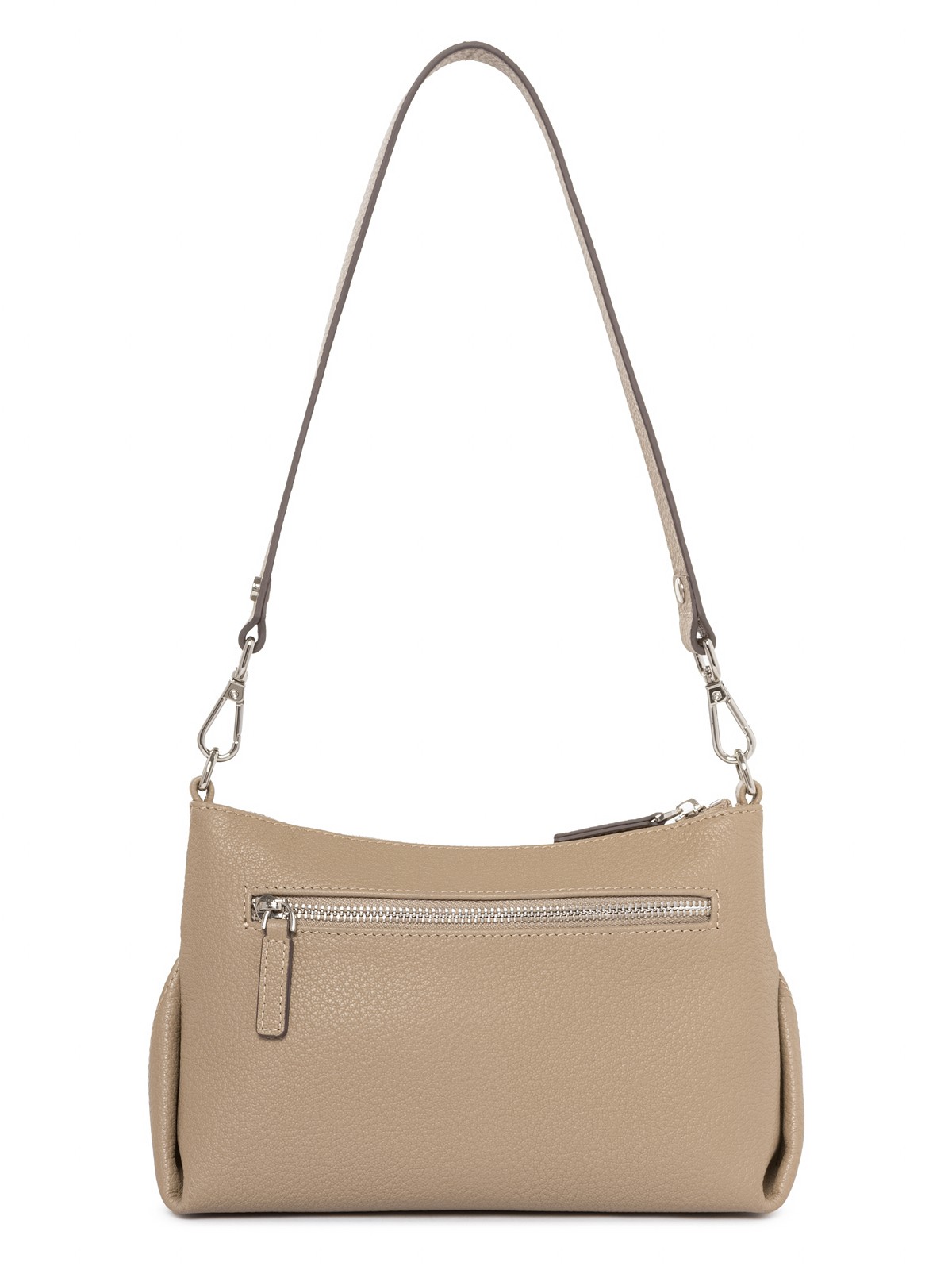 Женская сумка торговой марки Labbra из натуральной кожи. Модель застегивается на молнию. Содержит одно отделение в котором имеются карман на молнии и четыре кармашка для пластиковых карт. На передней и задней стенках есть карманы на молнии. Высота ручки - 29 см. Длина регулируемого съемного плечевого ремня - 130 см ширина - 38 см. Модель не имеет ножки на дне. Не вмещает формат А4.