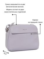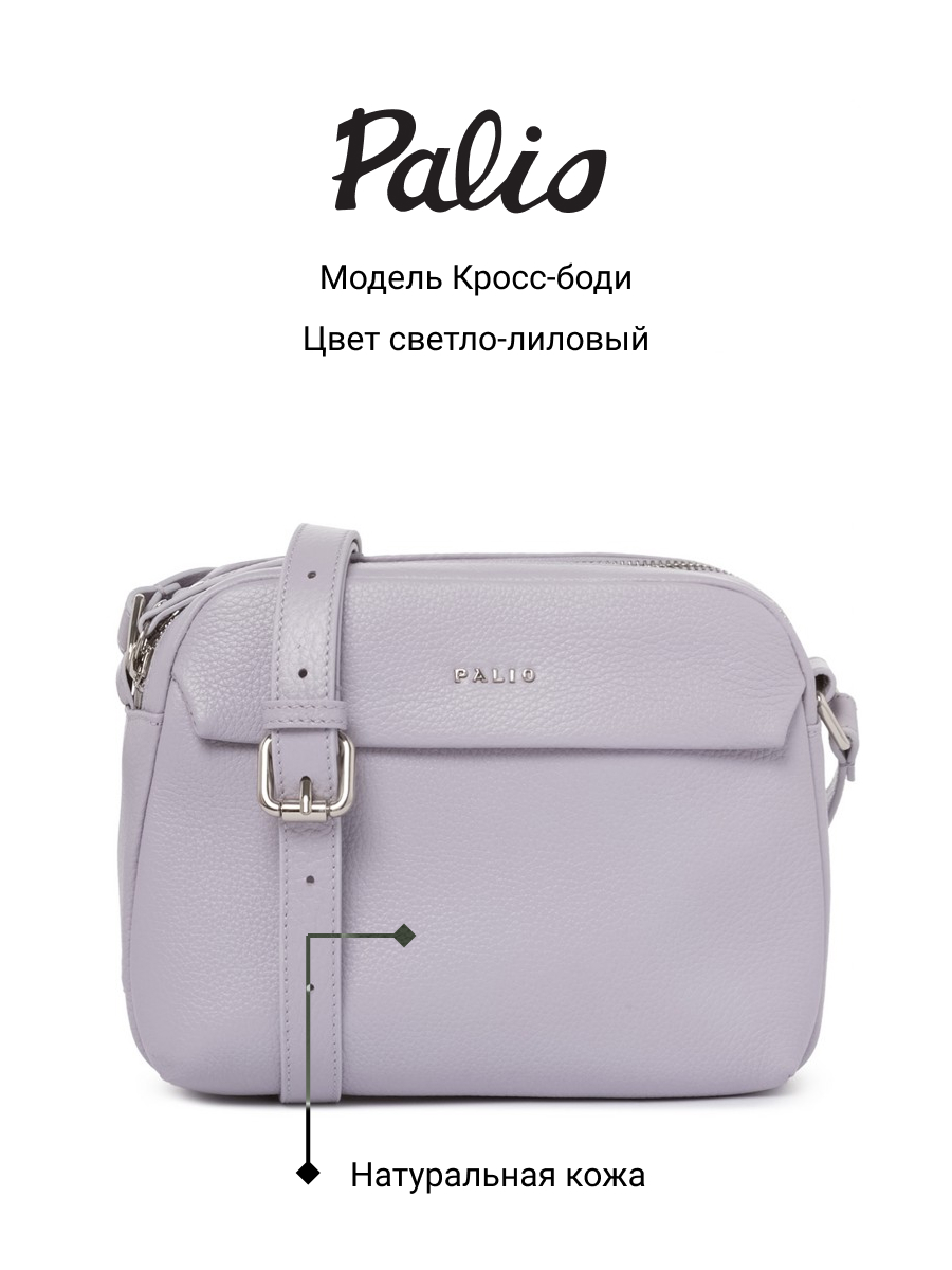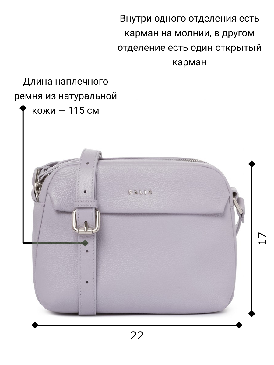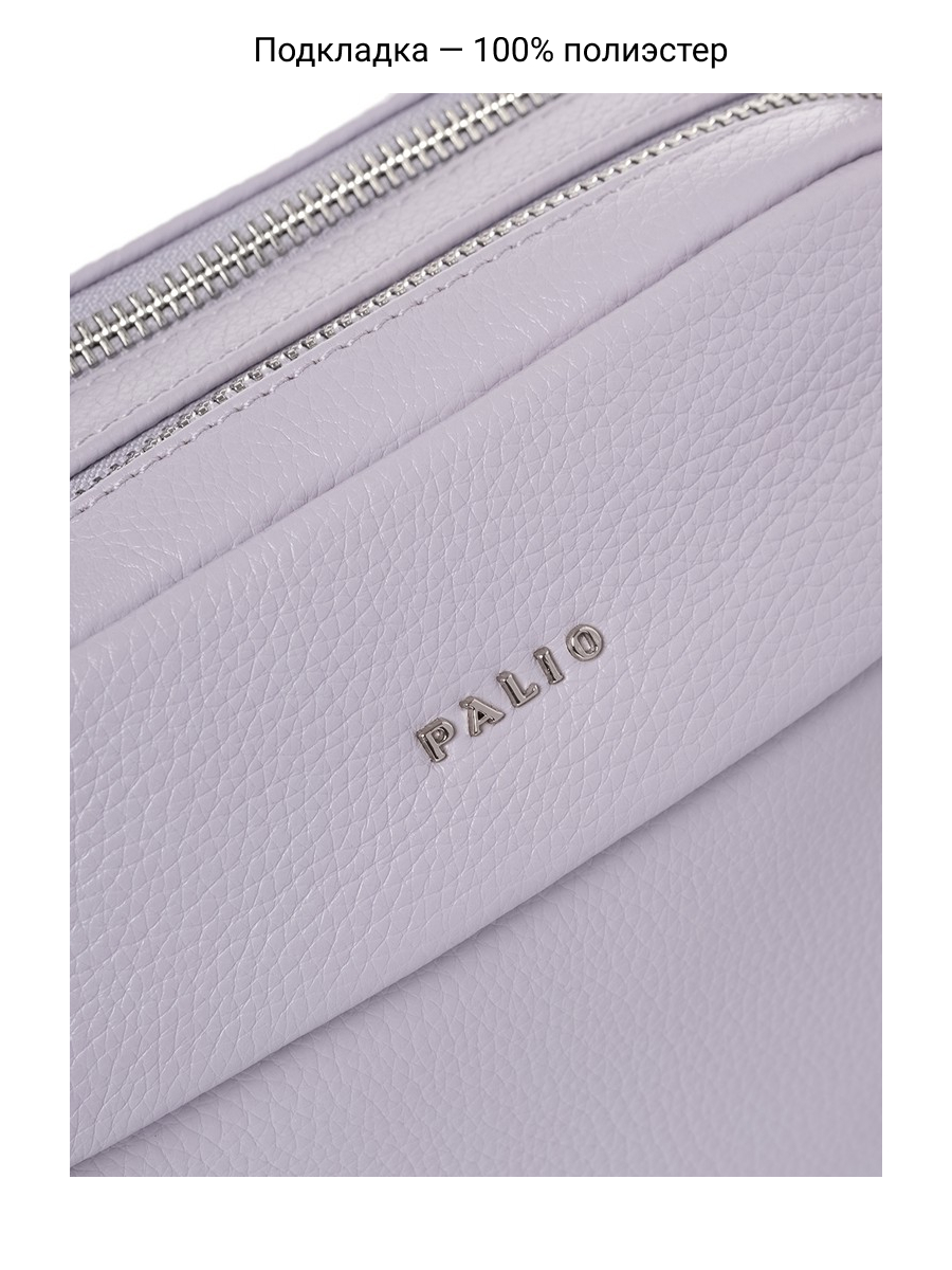 Женская сумка торговой марки Palio из натуральной кожи. Сумка закрывается на две металлические молнии. Модель состоит из двух самостоятельных отделений. Внутри одного отделения есть карман на молнии в другом отделение есть один открытый карман. Сумка имеет карманы на передней и задней стенках. Длина наплечного ремня - 115 см. Модель не имеет ножки на дне.