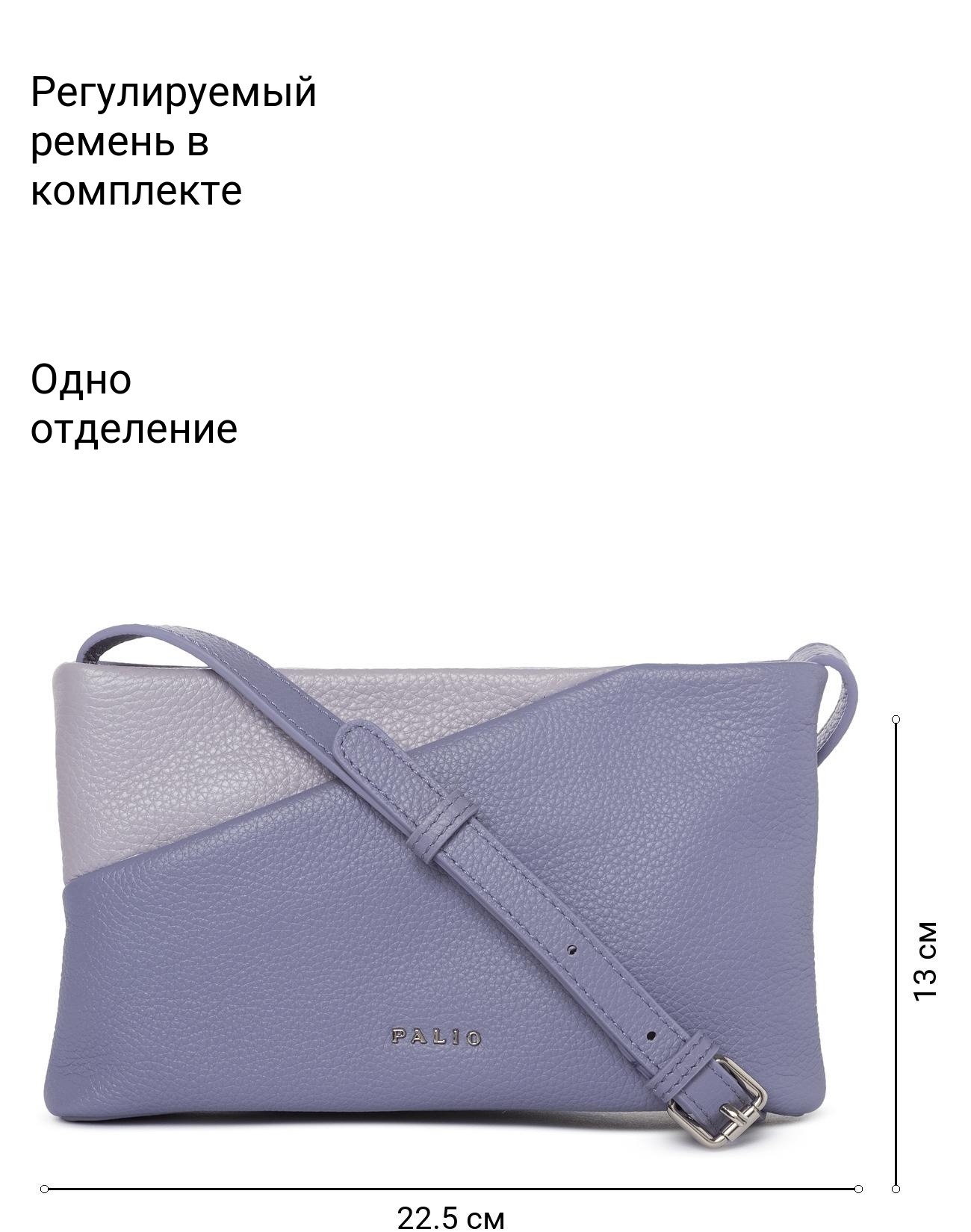 Женская сумка торговой марки Palio из натуральной кожи. Модель застегивается на молнию. Содержит внутри одно отделение в котором имеются карман на молнии и открытый карман. На передней стенке есть открытый карман. Длина регулируемого несъемного плечевого ремня из натуральной кожи - 115 см ширина - 15 см. Модель не имеет ножки на дне. Не вмещает формат А4.