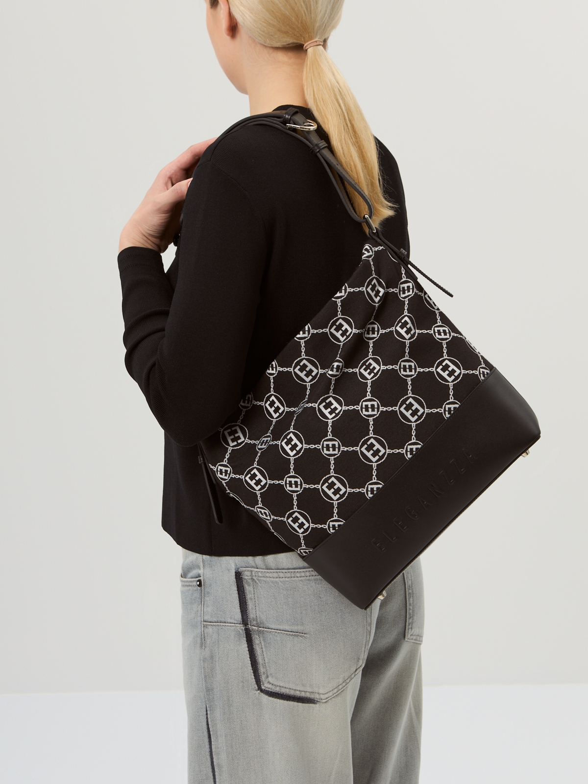 Женская сумка торговой марки Eleganzza с отделкой из натуральной кожи и фирменным логотипом бренда выполнена из прочного синтетического волокна с водоотталкивающей пропиткой что обеспечивает долговечность и практичность изделия. Модель застегивается на молнию. Внутри одно отделение с карманом на молнии и двумя открытыми карманами. Высота ручки - 25 см. Модель имеет ножки на дне. Вмещает формат А4.