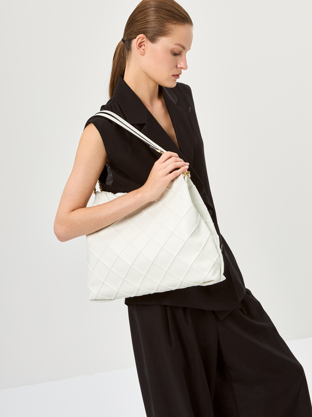 Женская сумка торговой марки Eleganzza изготовлена из высококачественной пластичной но тонкой натуральной кожи обработанной с применением сложной двойной диагональной строчки. Модель застегивается на молнию. Внутри одно отделение с карманом на молнии и двумя открытыми карманами. Высота ручек - 24 см. Модель не имеет ножки на дне. Вмещает формат А4.