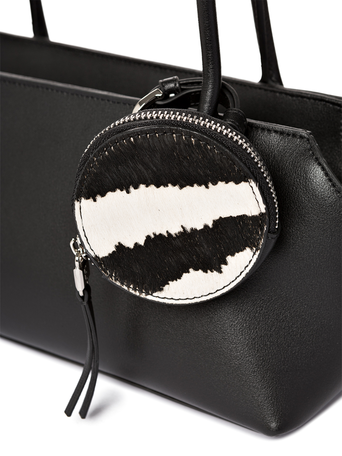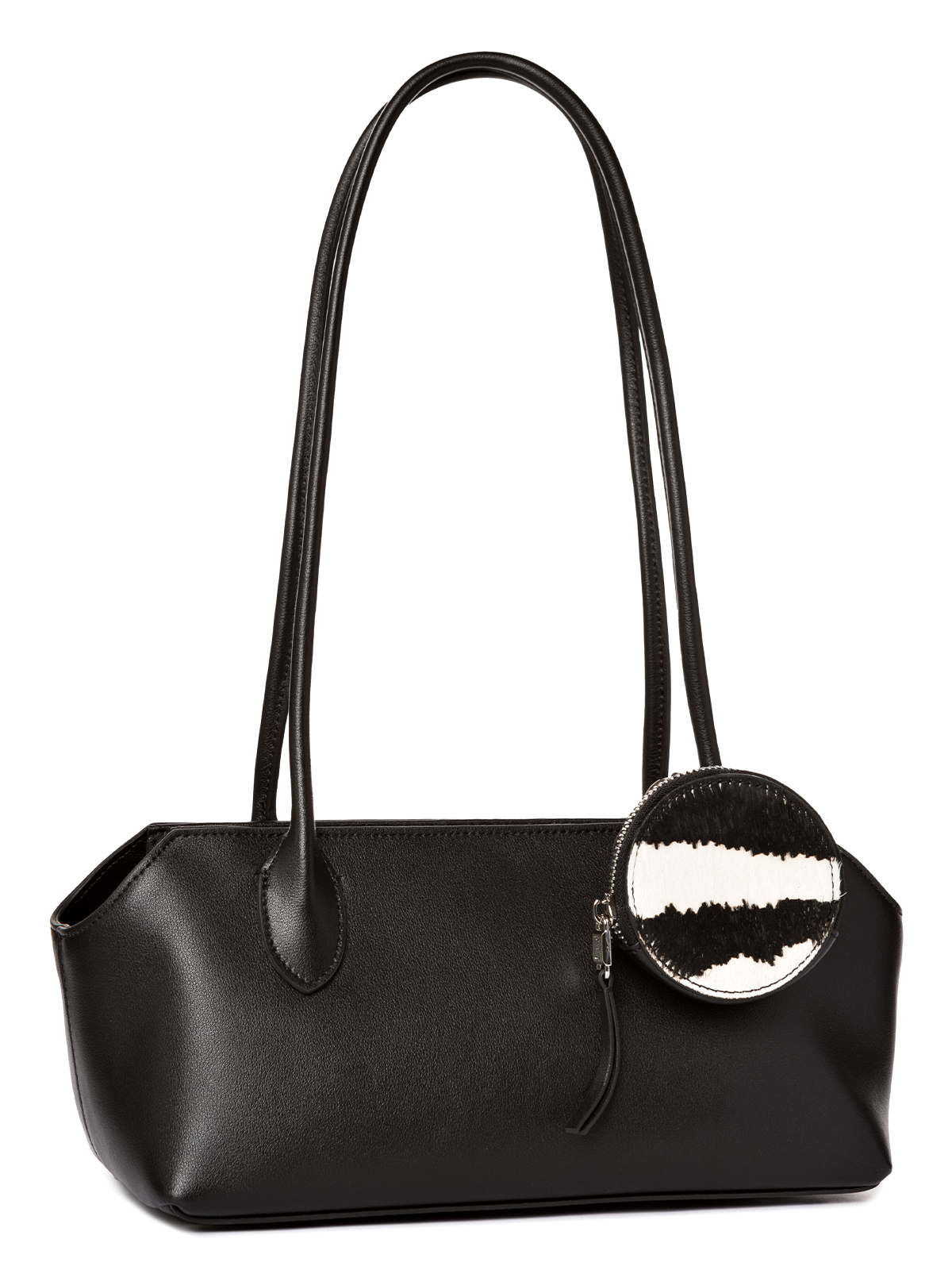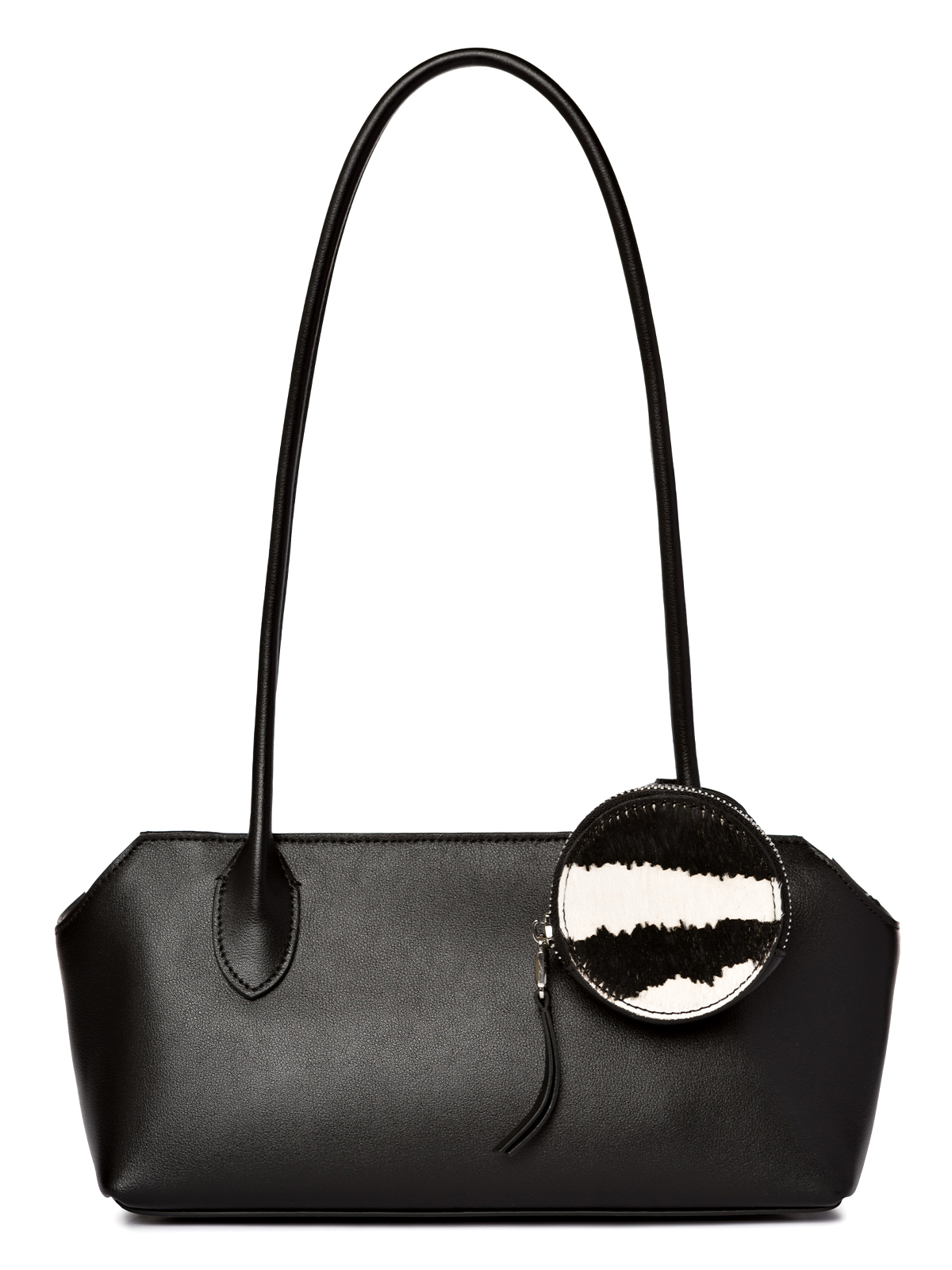 Женская сумка торговой марки Eleganzza из натуральной кожи. Тренд сезона – лаконичная горизонтальная модель с длинными ручками для ношения на плече. В черном цвете сумка дополнена стильным съемным аксессуаром – круглым кошельком с меховой передней стенкой с принтом «зебра». Этот многофункциональный элемент можно носить как браслет на руке или крепить к поясному ремню создавая оригинальные образы. Застегивается на молнию. Внутри одно отделение с карманом на молнии и открытым карманом. Высота ручек - 31 см. Модель имеет ножки на дне. Не вмещает формат А4.