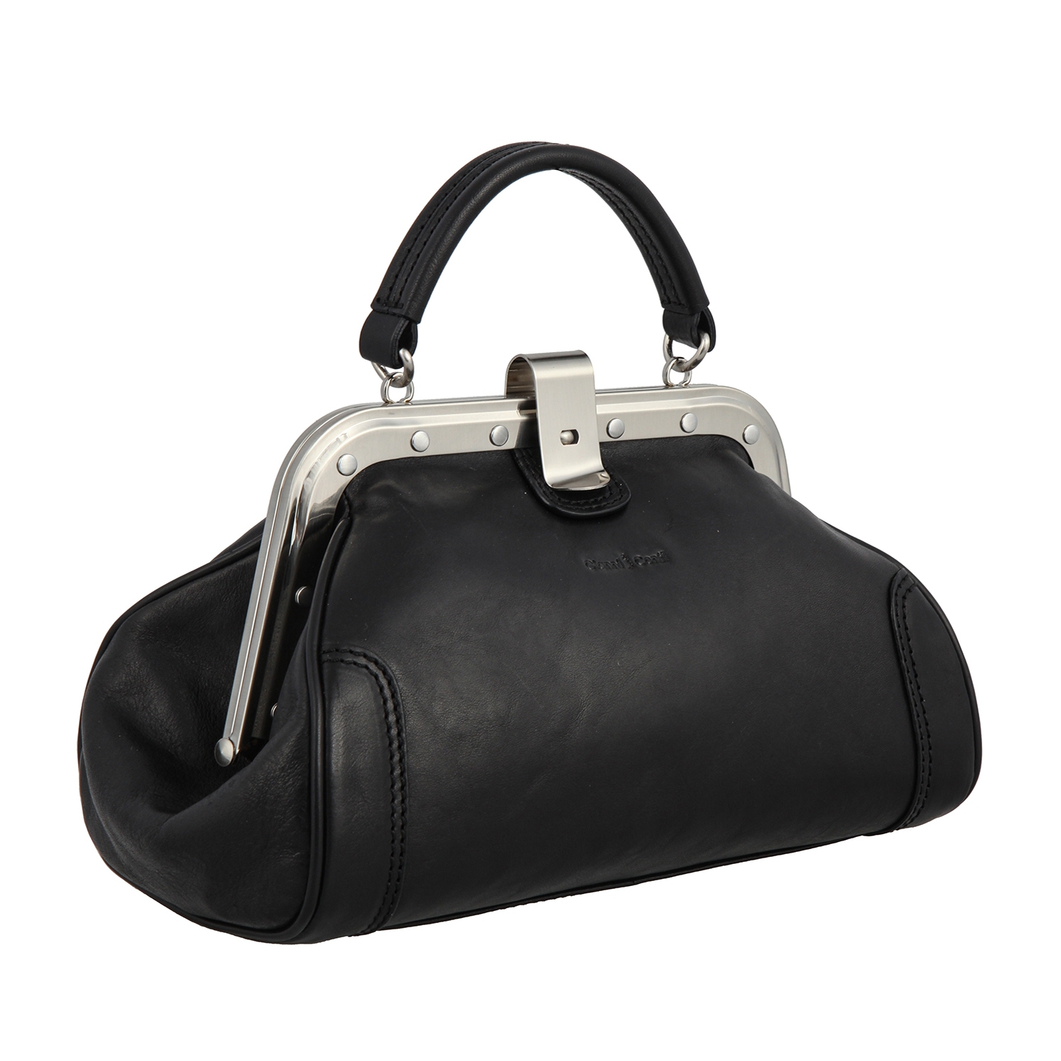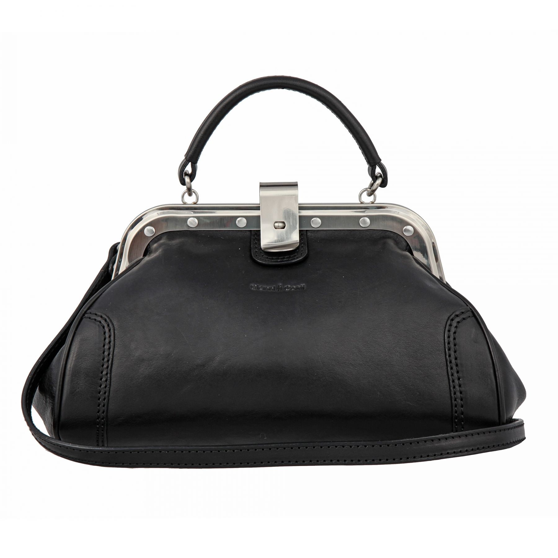 Оригинальная женская сумка-саквояж из натуральной кожи черного цвета. Внутри одно вместительное отделение, два кармашка для мелких предметов, держатель для авторучки, карман для документов на молнии. Закрывается на оригинальный замок. Оснащена съёмным регулируемым плечевым ремнём на карабинах.