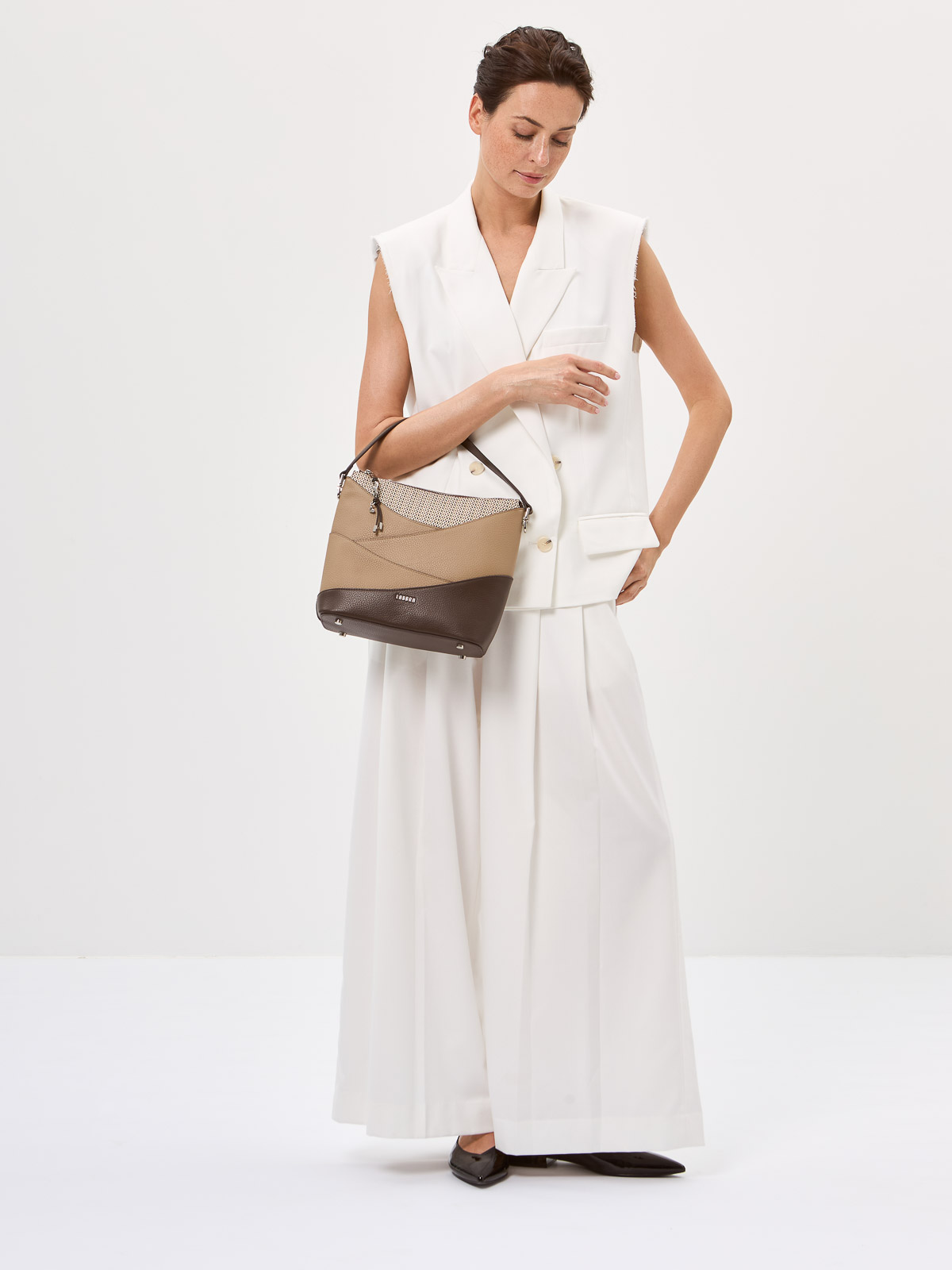 Женская сумка торговой марки Labbra из натуральной кожи. Принт изделия отражает мировой тренд на натуральность и природные мотивы. Он нанесен на лицевую сторону натуральной кожи с использованием сеточной технологии создавая эффект ткани из натурального льна. Тиснение подчеркивает текстуру усиливая реалистичность рисунка. Новая айдентика любимого бренда представлена в оригинальной подвеске из кожи с авторской фурнитурой. Модель застегивается на молнию. Содержит внутри один отдел в котором имеются карман на молнии и два открытых кармана. Высота ручки - 12 см. Максимальная длина регулируемого съемного плечевого ремня из натуральной кожи - 117 см ширина - 15 см. Модель имеет ножки на дне. Не вмещает формат А4.