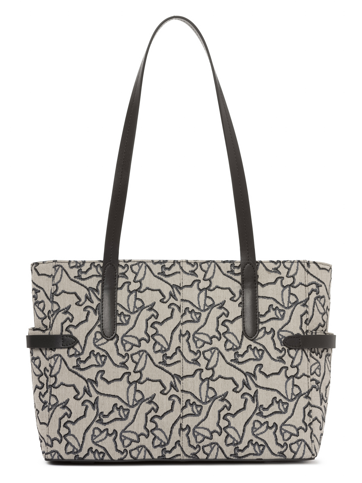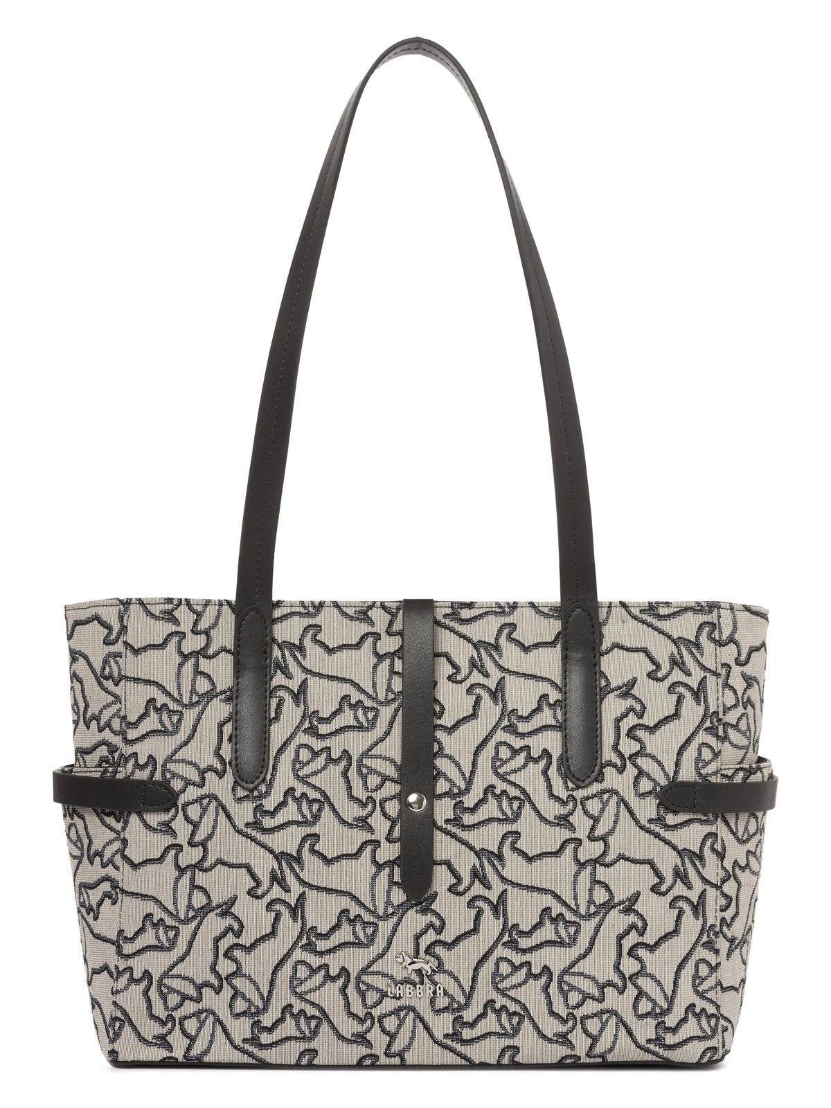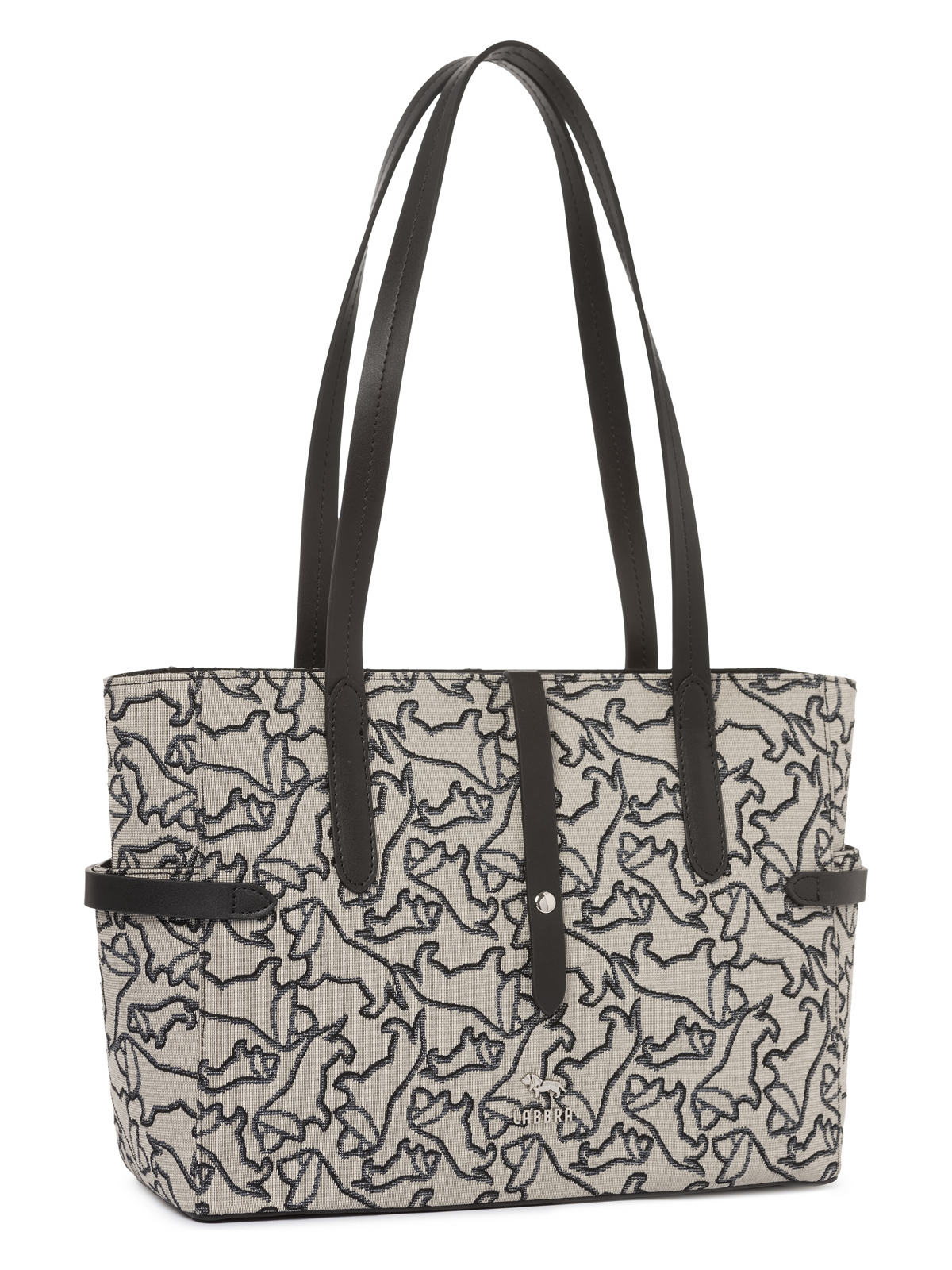 Женская сумка торговой марки Labbra из плотного жаккардового полиэстера с отделкой из натуральной кожи декорированная эксклюзивным авторским принтом с символикой бренда - собачкой. Модель застегивается на молнию. Внутри одно отделение с двумя карманами на молнии карманом на кнопке и четырьмя кармашками для пластиковых карт. По бокам сумки есть открытые карманы. Высота ручек - 29 см. Модель не имеет ножек на дне. Вмещает формат А4.
