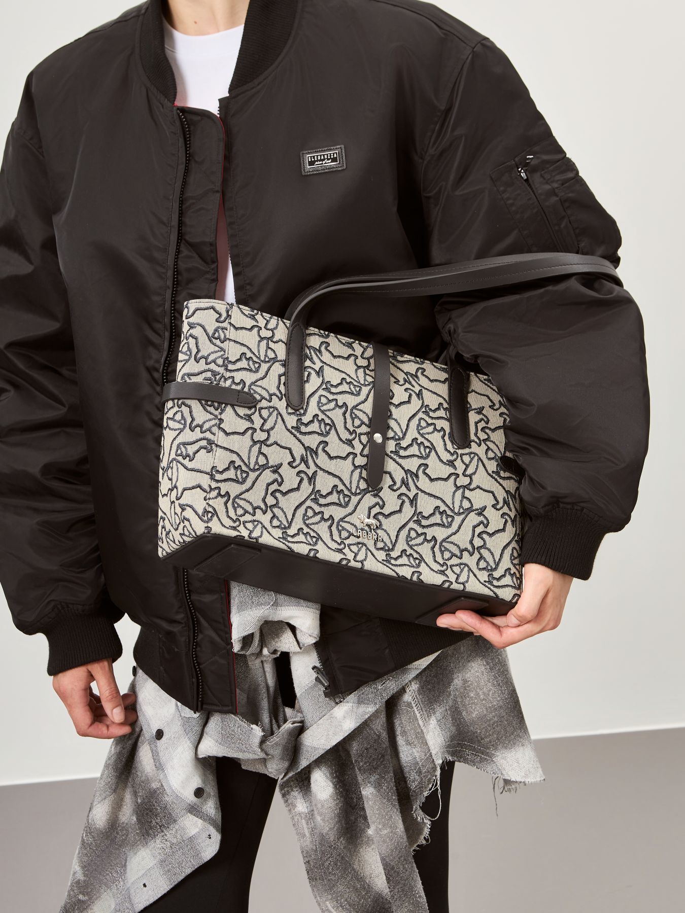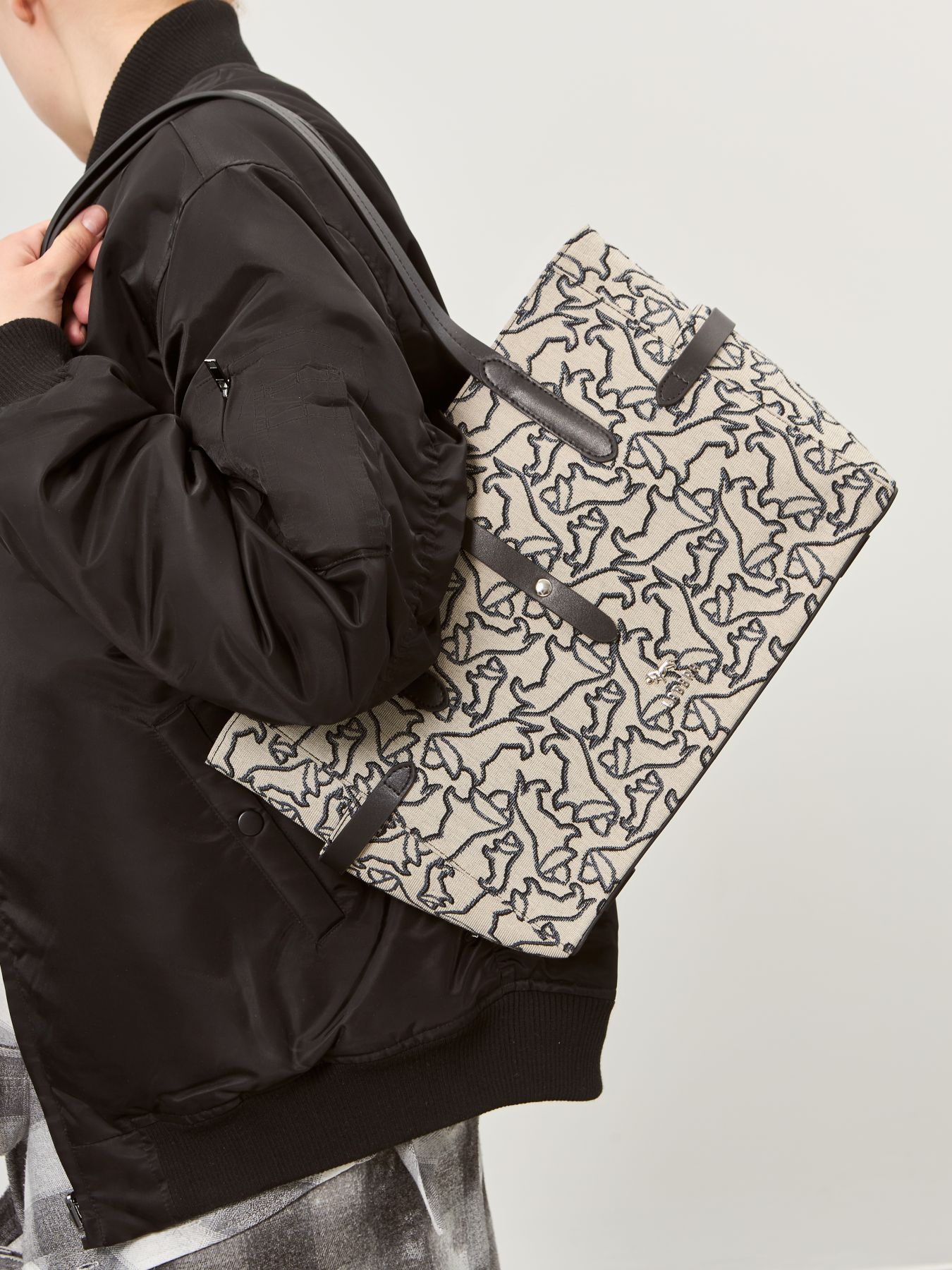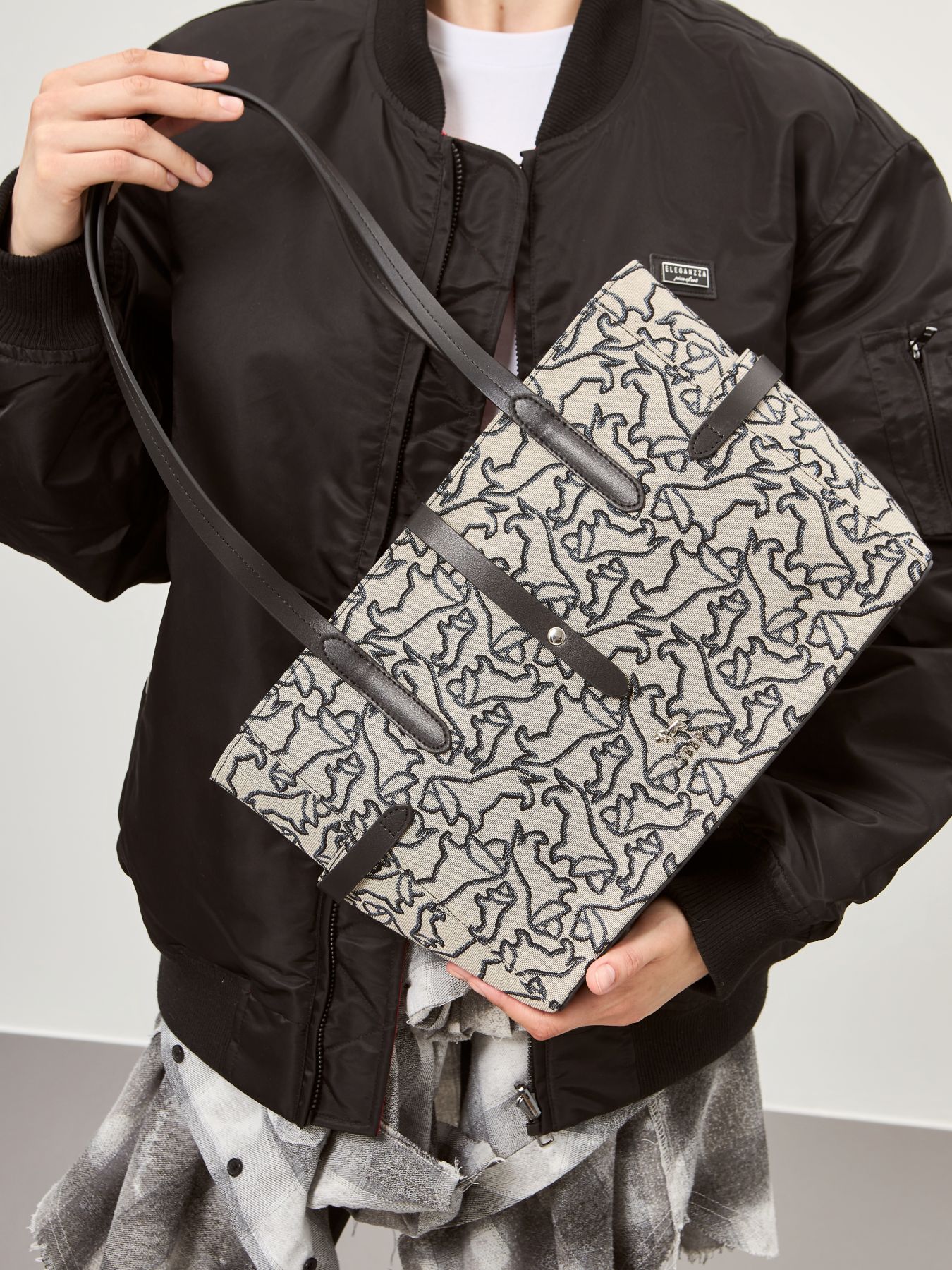 Женская сумка торговой марки Labbra из плотного жаккардового полиэстера с отделкой из натуральной кожи декорированная эксклюзивным авторским принтом с символикой бренда - собачкой. Модель застегивается на молнию. Внутри одно отделение с двумя карманами на молнии карманом на кнопке и четырьмя кармашками для пластиковых карт. По бокам сумки есть открытые карманы. Высота ручек - 29 см. Модель не имеет ножек на дне. Вмещает формат А4.