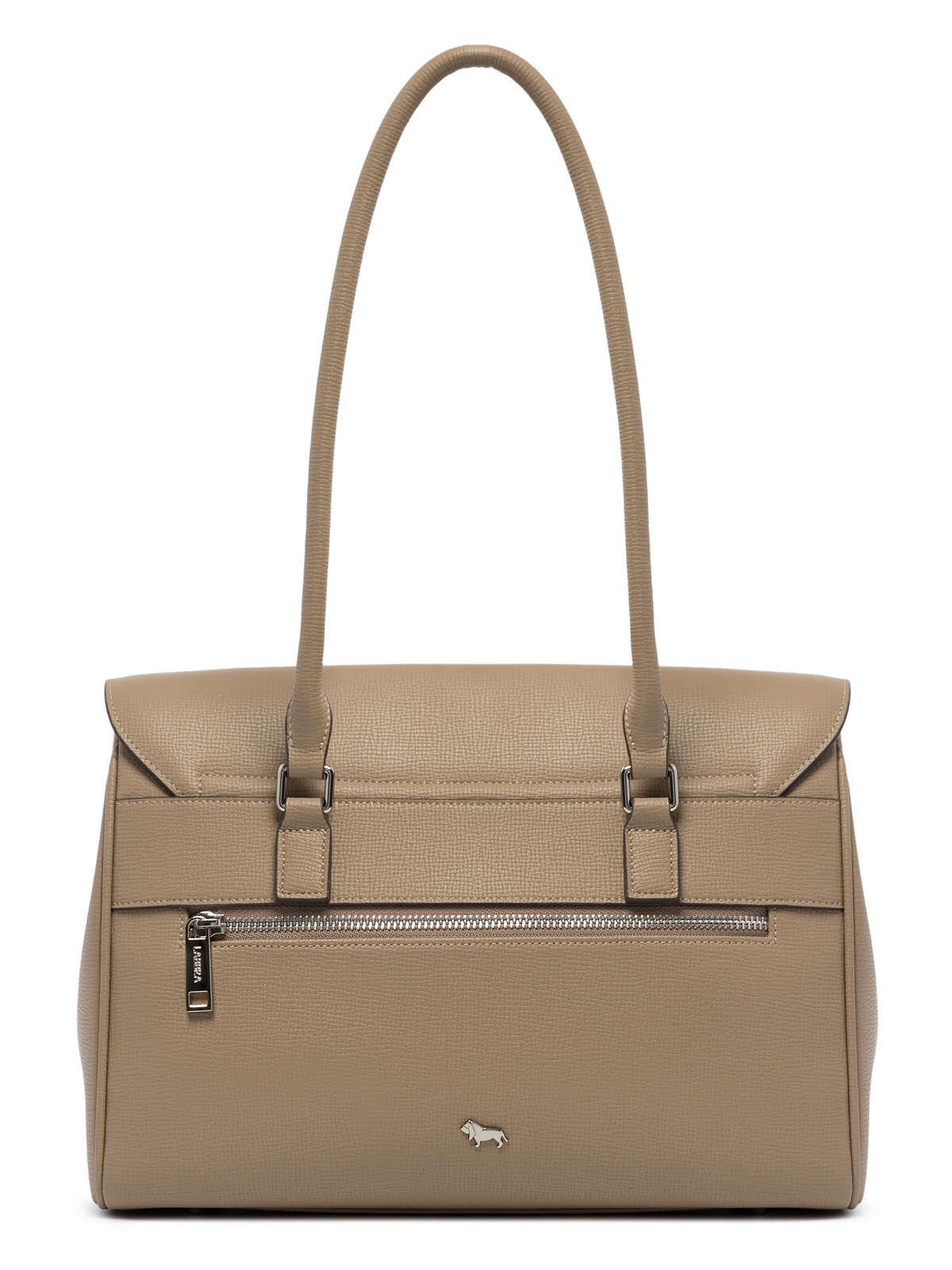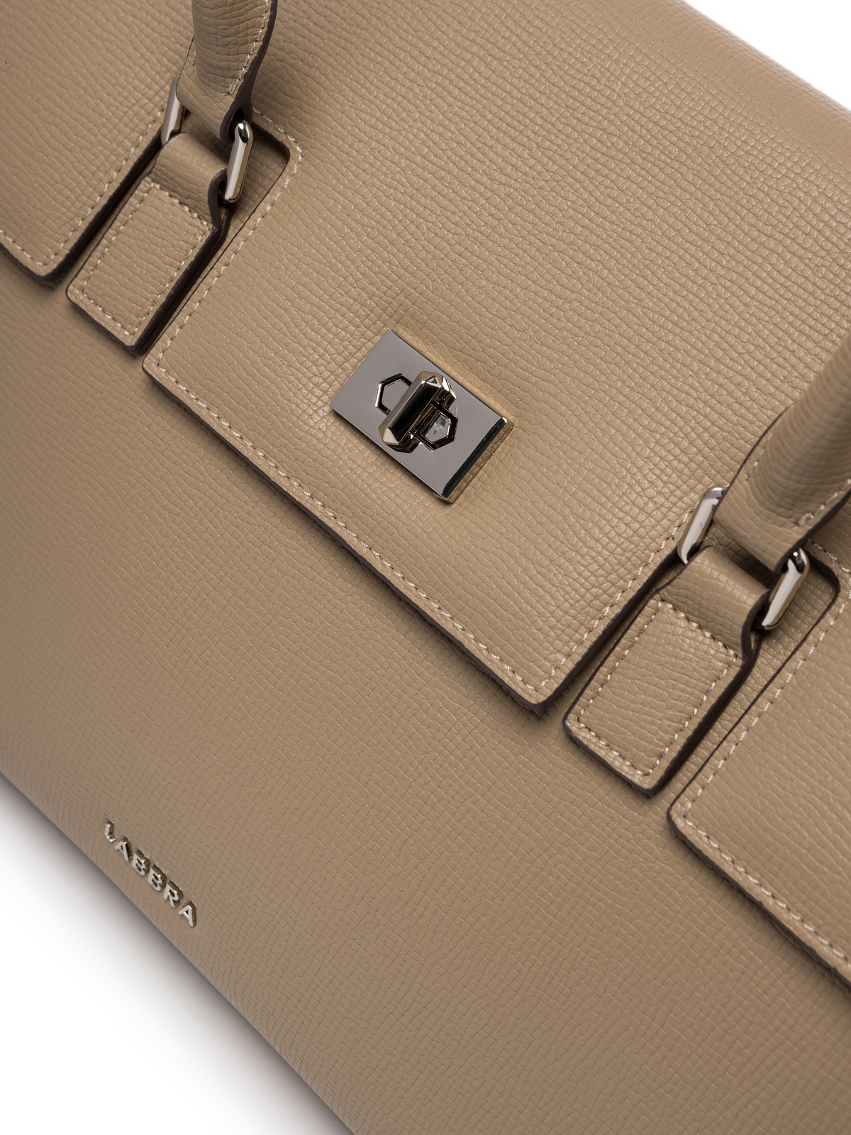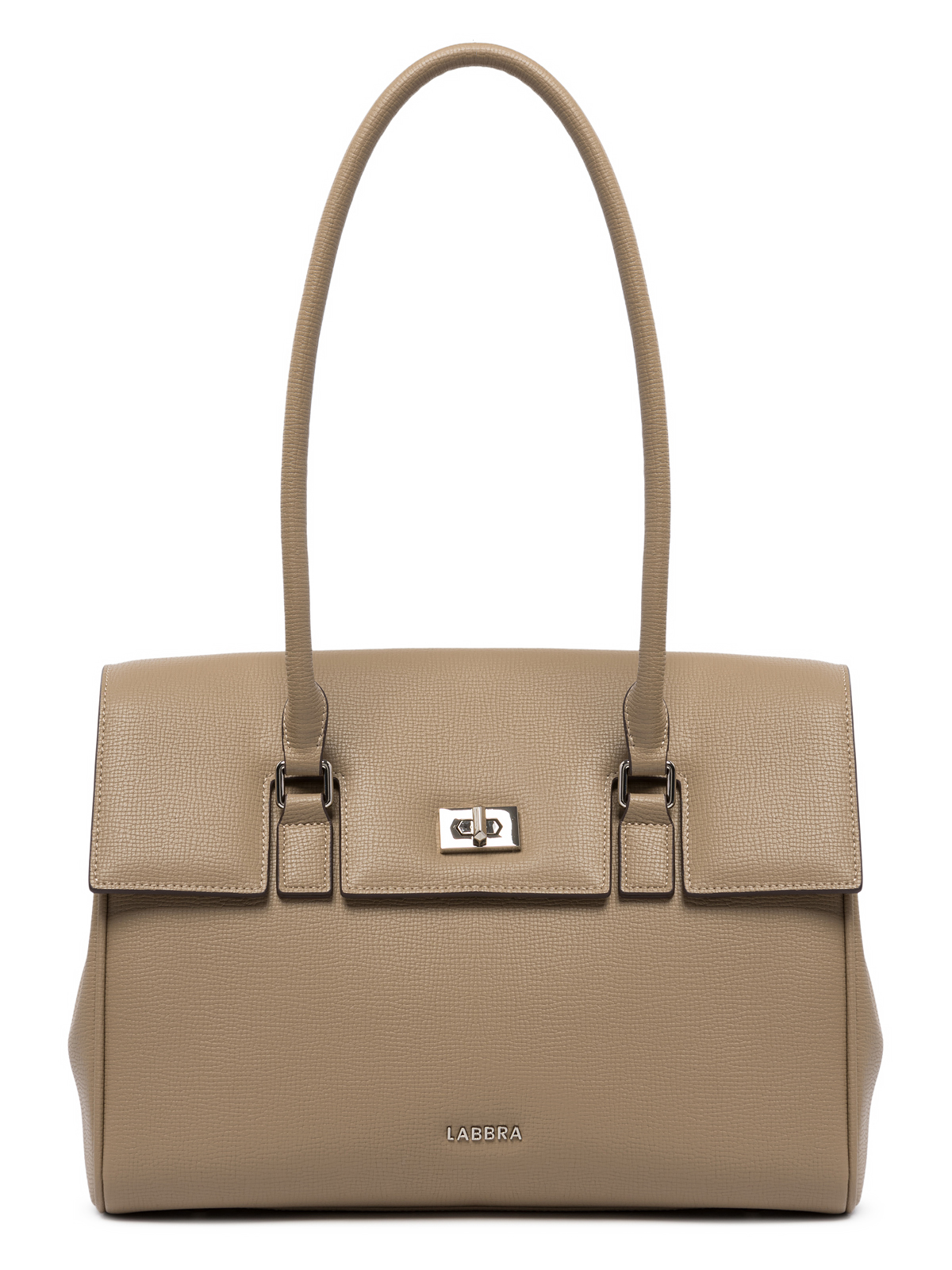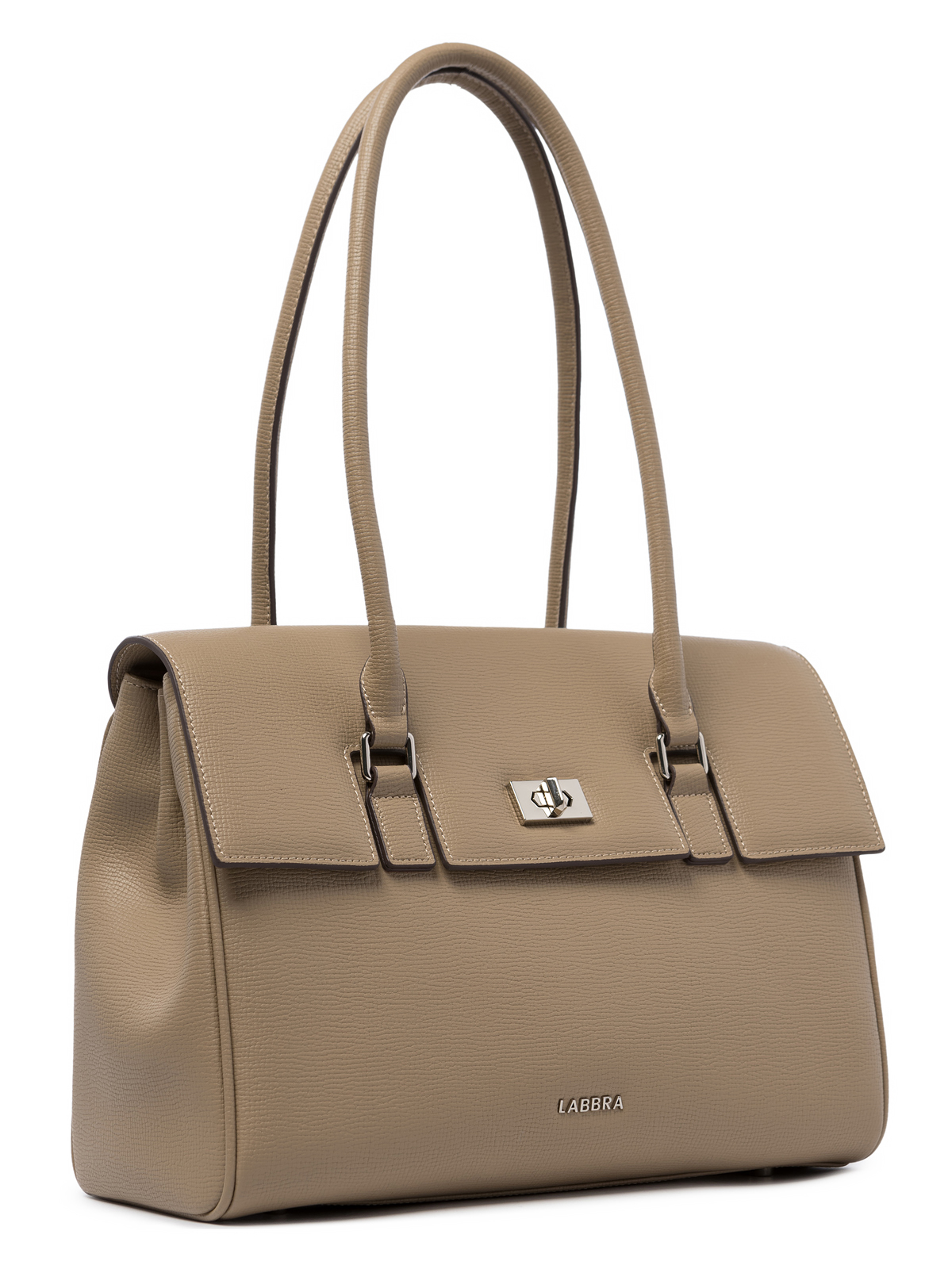 Женская сумка торговой марки Labbra из натуральной кожи. Модель закрывается клапаном на замок. Содержит внутри два отдела между которыми имеется отделение на молнии. В одном отделе имеется карман на липучке в другом - открытый карман. На задней стенке есть карман на молнии в котором имеется петля из тесьмы для фиксации сумки на ручке чемодана. Высота ручек - 25 см. Модель имеет ножки на дне. Не вмещает формат А4.