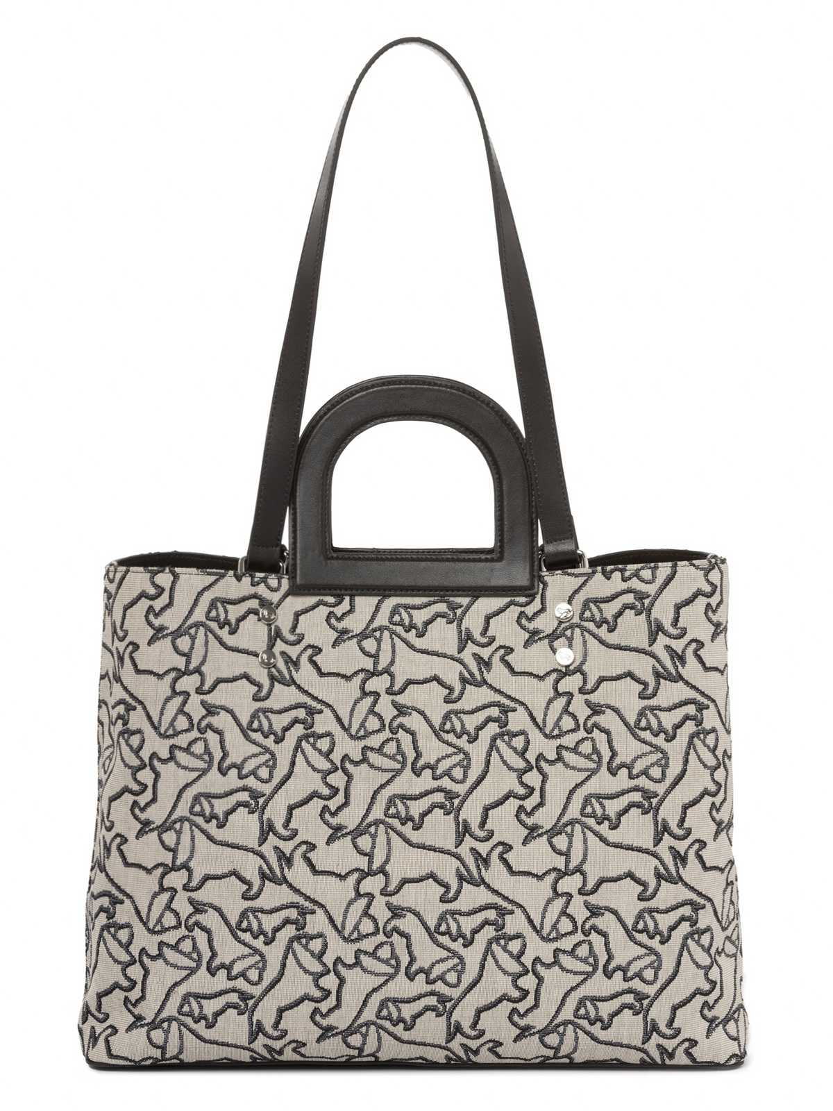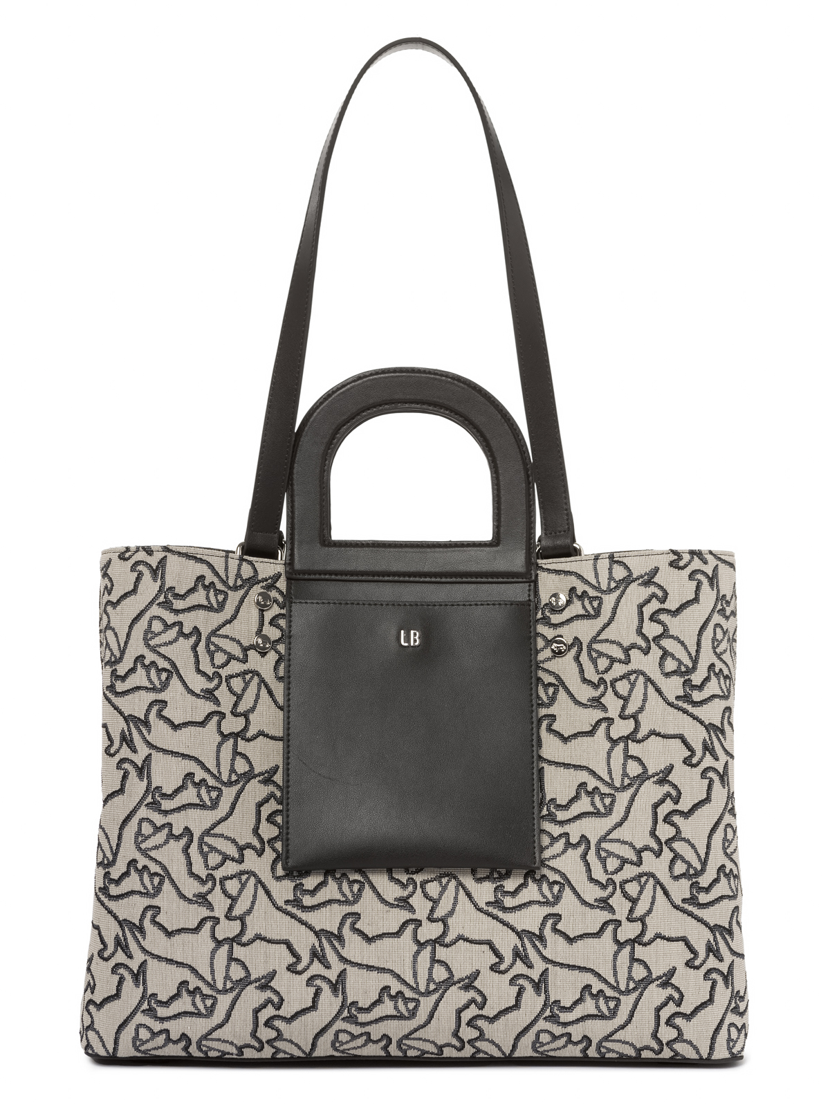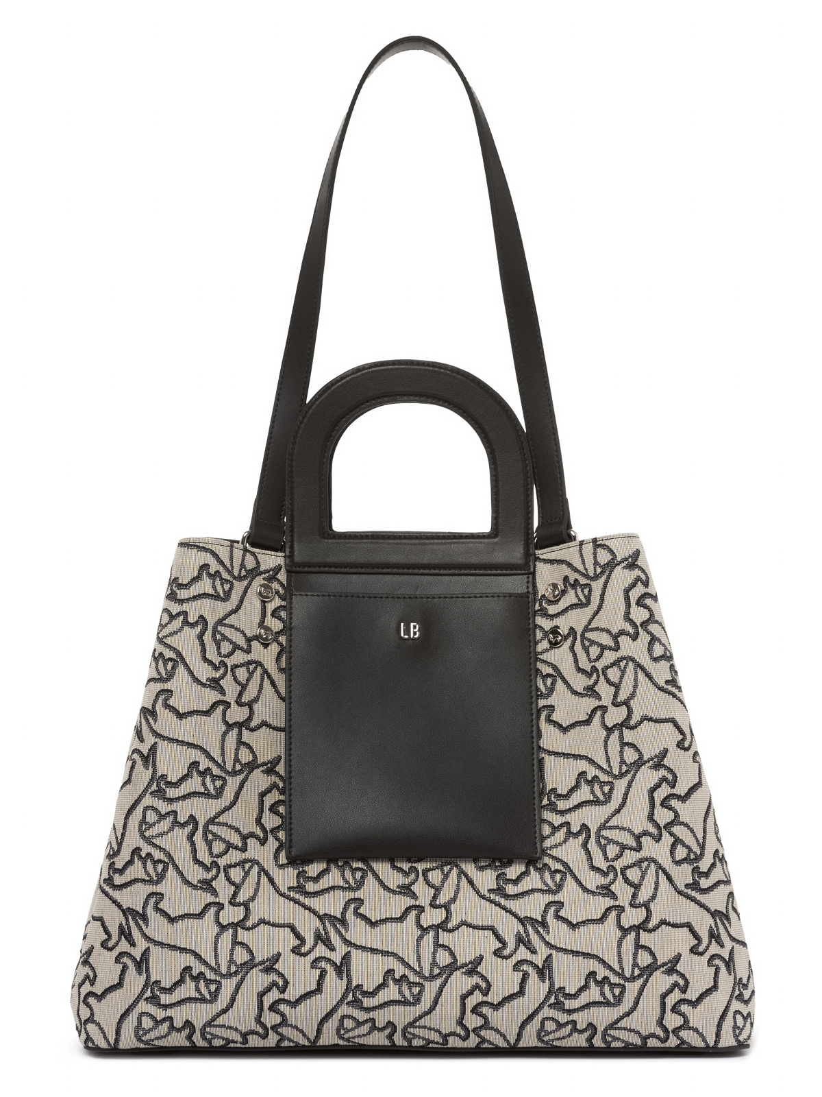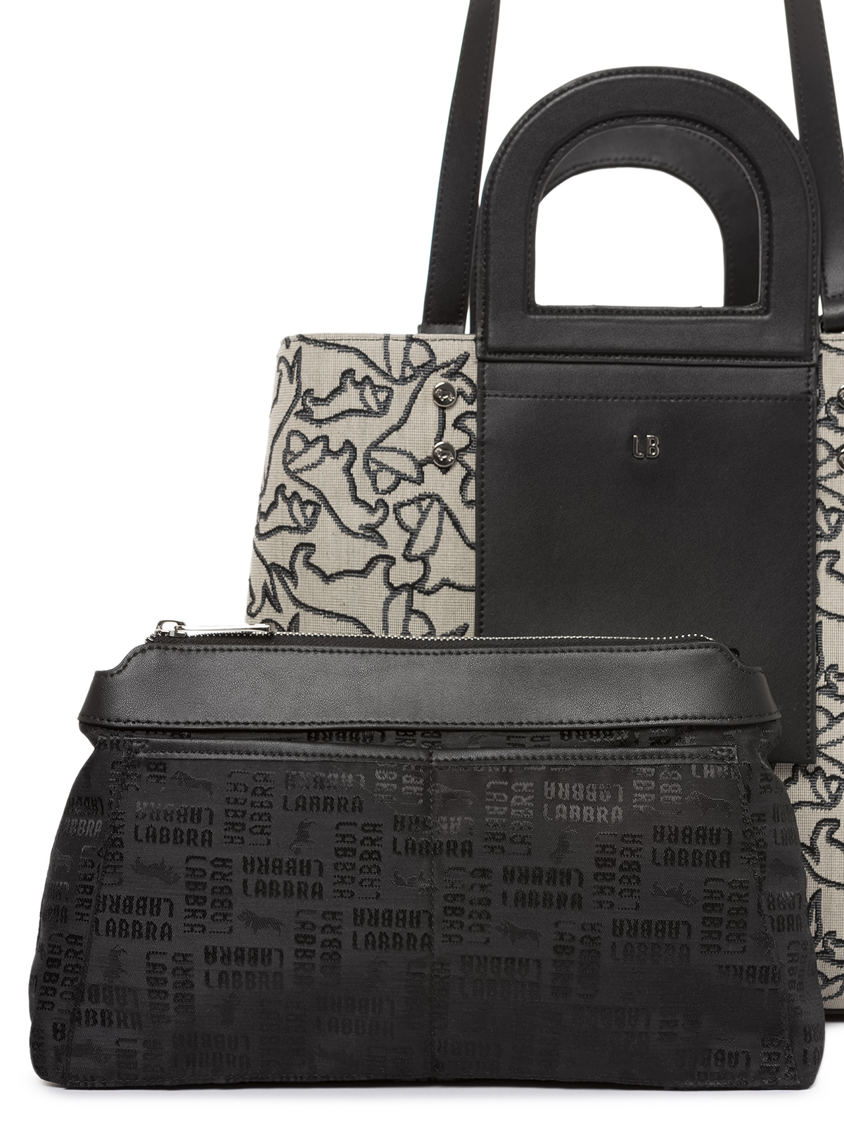 Женская сумка торговой марки Labbra из плотного жаккардового полиэстера с отделкой из натуральной кожи декорированная эксклюзивным авторским принтом с символикой бренда - собачкой. Модель застегивается на магнитную кнопку и хлястик. Внутри одно отделение с карманом на молнии открытым карманом и вкладной косметичкой. Косметичка имеет два внешних открытых кармана и внутренний карман на молнии. На передней стенке сумки есть открытый карман. Высота ручек - 27 см. Модель не имеет ножек на дне. Вмещает формат А4.