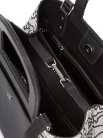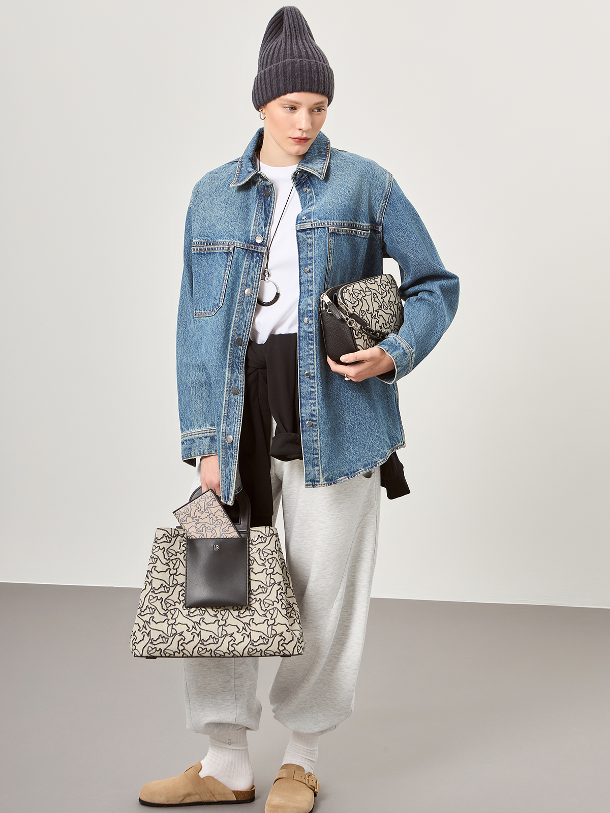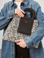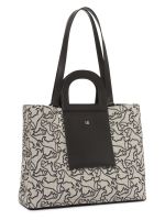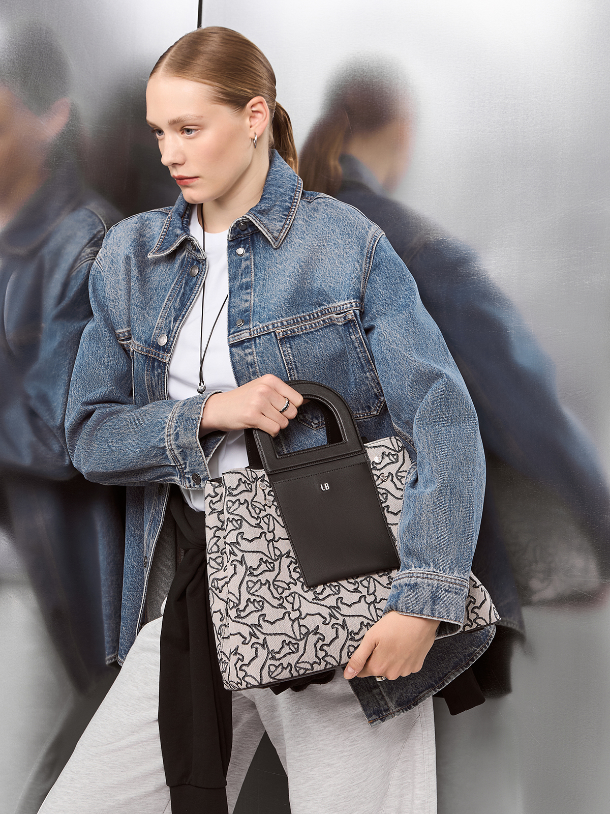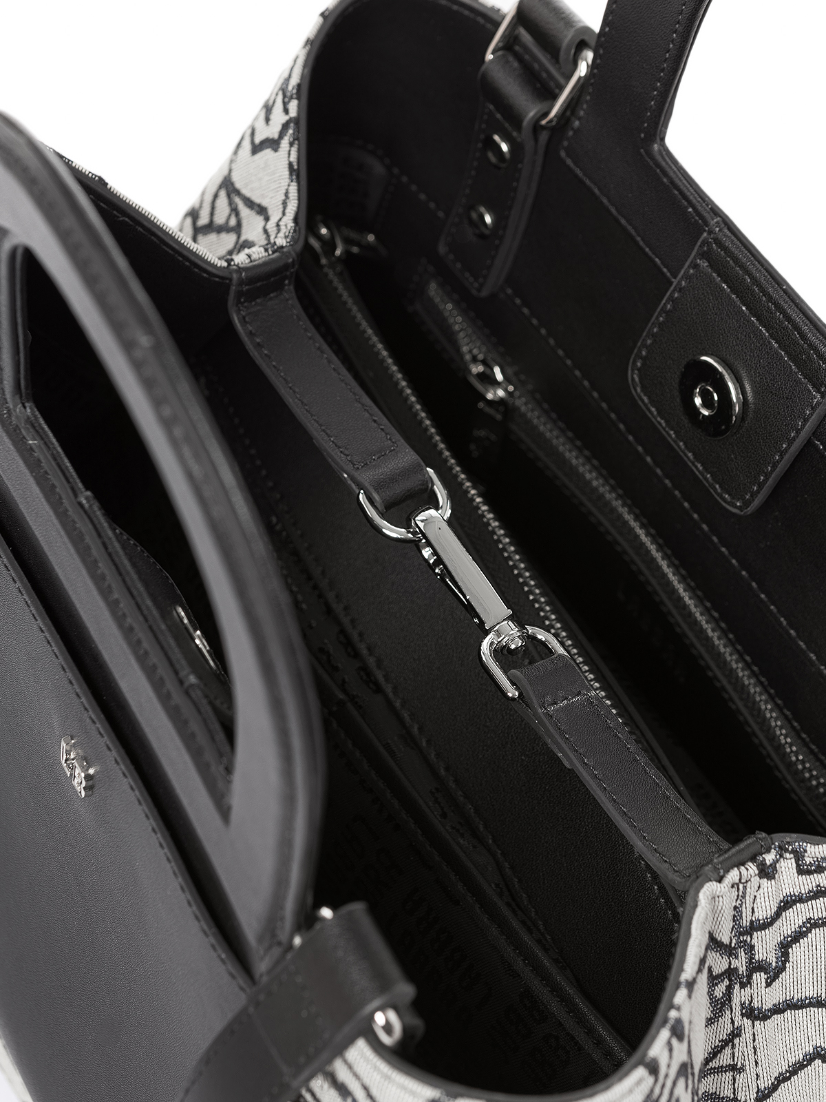 Женская сумка торговой марки Labbra из плотного жаккардового полиэстера с отделкой из натуральной кожи декорированная эксклюзивным авторским принтом с символикой бренда - собачкой. Модель застегивается на магнитную кнопку и хлястик. Внутри одно отделение с карманом на молнии открытым карманом и вкладной косметичкой. Косметичка имеет два внешних открытых кармана и внутренний карман на молнии. На передней стенке сумки есть открытый карман. Высота ручек - 27 см. Модель не имеет ножек на дне. Вмещает формат А4.