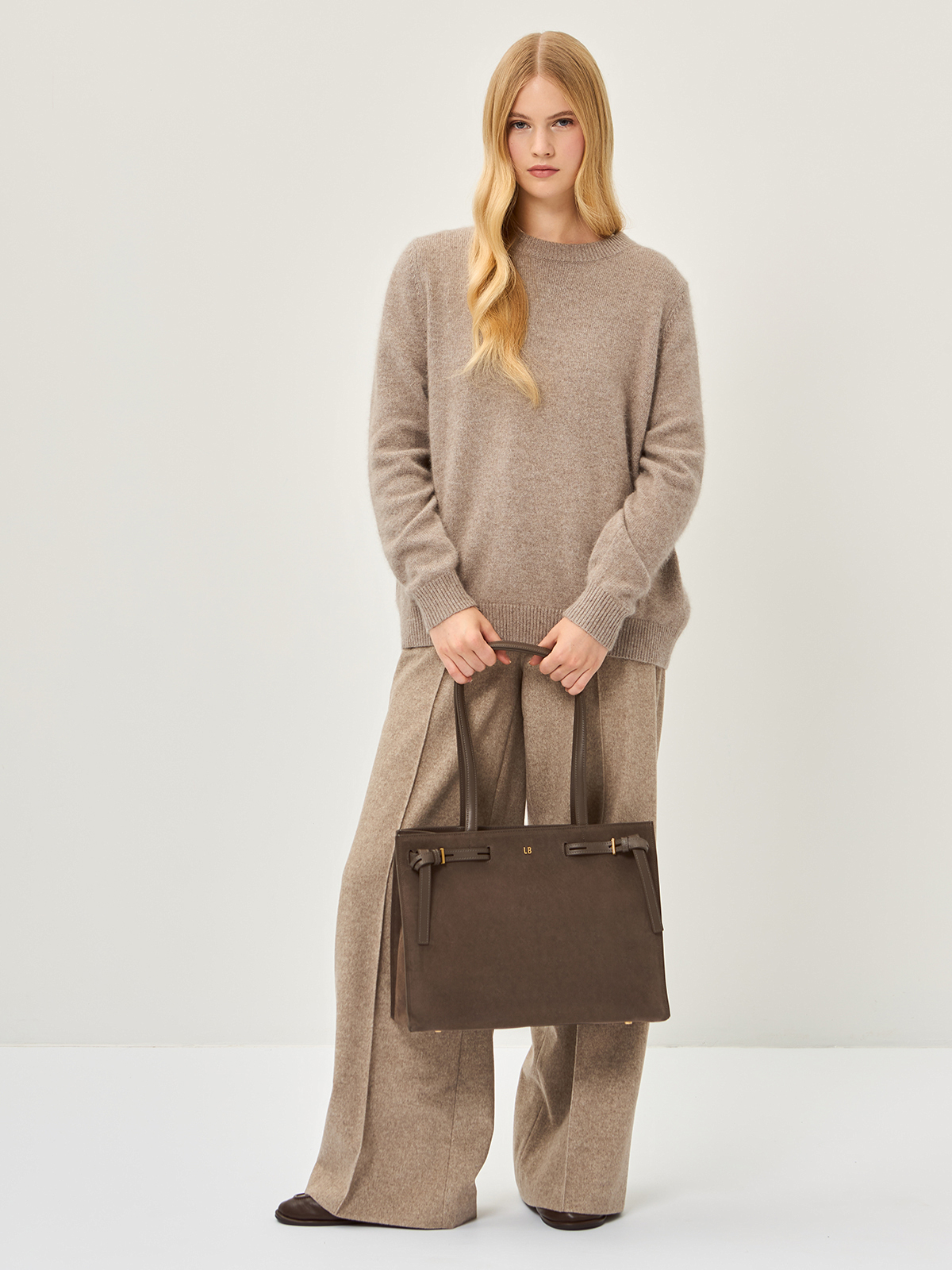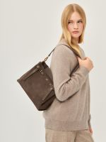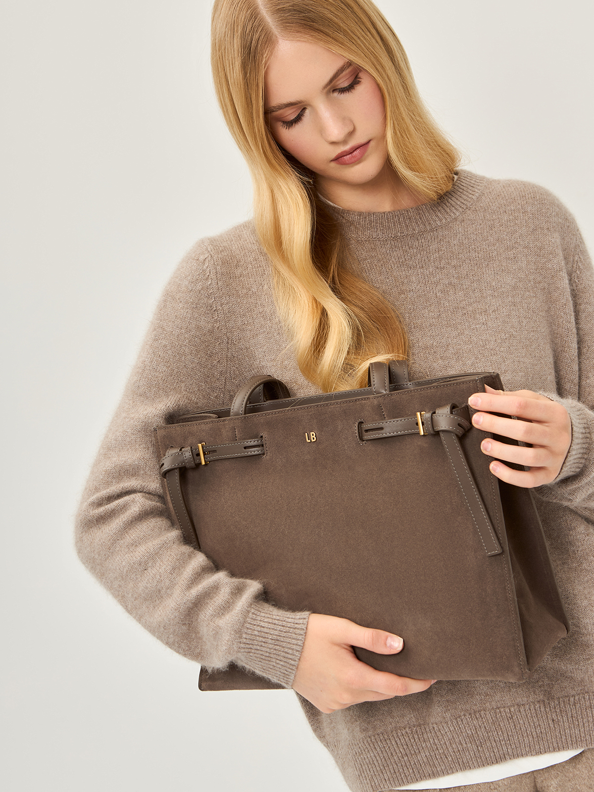 Трендовая новинка бренда - женская сумка Labbra из кожевенного велюра который гармонично сочетается с деталями из натуральной кожи. Модель застегивается на молнию. Внутри одно отделение с карманом на молнии и двумя открытыми карманами. На задней стенке сумки есть карман на молнии. Высота ручек - 28 см. Модель имеет ножки на дне. Вмещает формат А4.