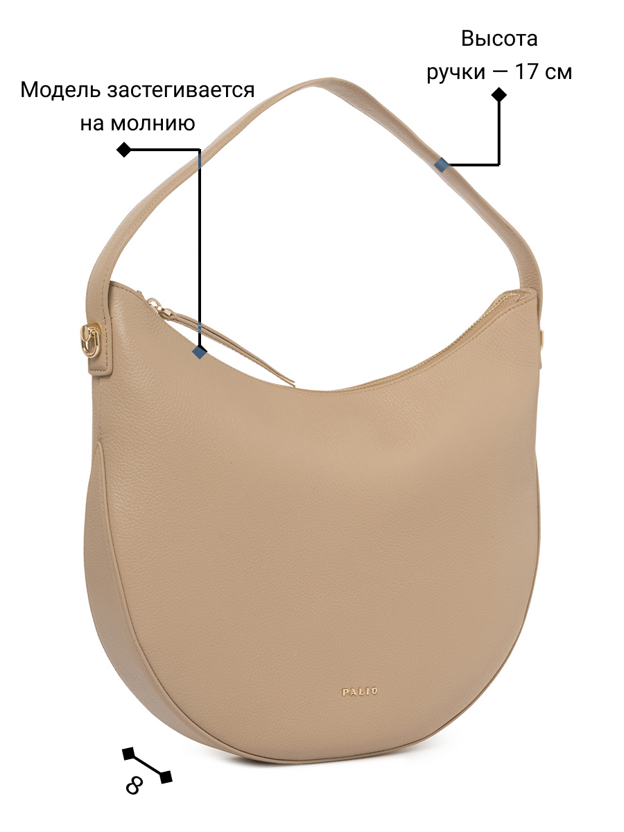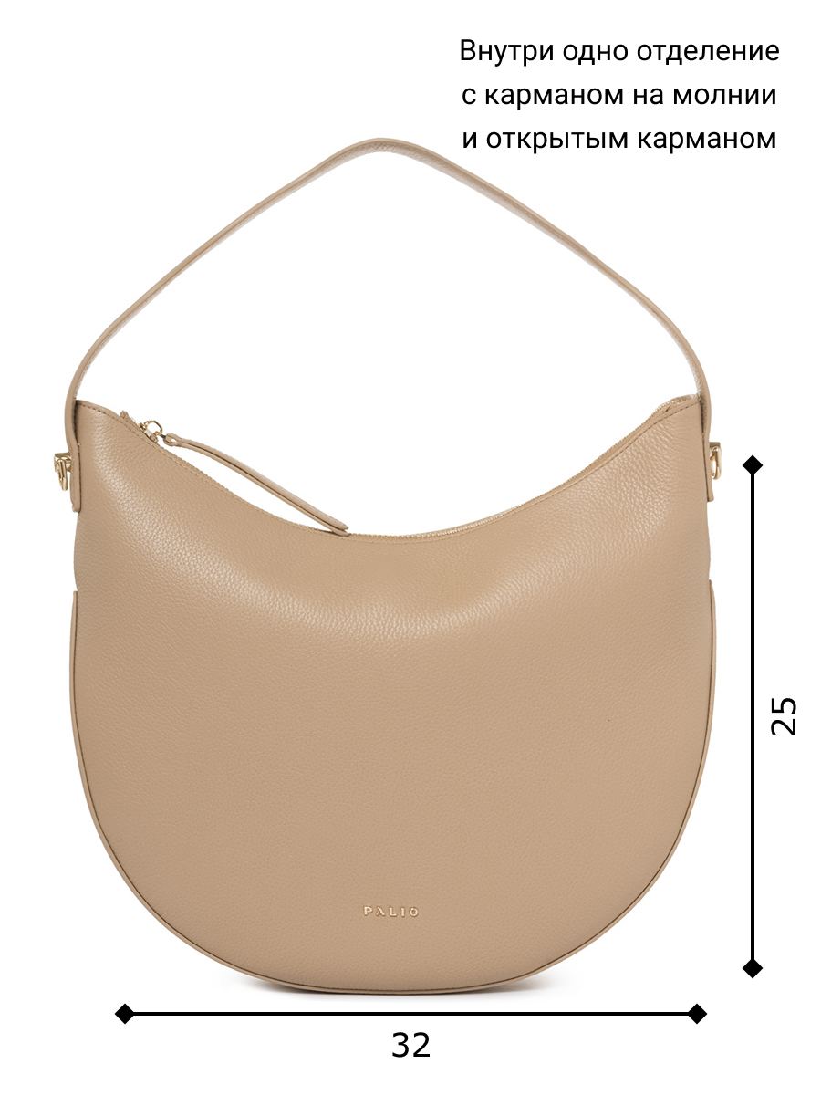 Женская сумка торговой марки Palio. Модель закрывается на металлическую молнию. Внутри одно отделение с карманом на молнии и открытым карманом. Высота ручки - 17 см. Длина наплечного ремня из натуральной кожи - 118 см. ширина - 15 см. Модель не имеет ножки на дне. Не вмещает формат А4.