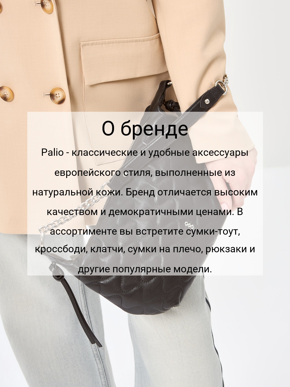 Женская сумка торговой марки Palio из натуральной кожи. Модель застегивается на молнию. Содержит внутри одно отделение в котором имеются карман на молнии и открытый карман. Высота ручки - 26 см. Длина регулируемого съемного плечевого ремня из натуральной кожи - 99 см ширина - 15 см. Модель не имеет ножки на дне. Не вмещает формат А4.
