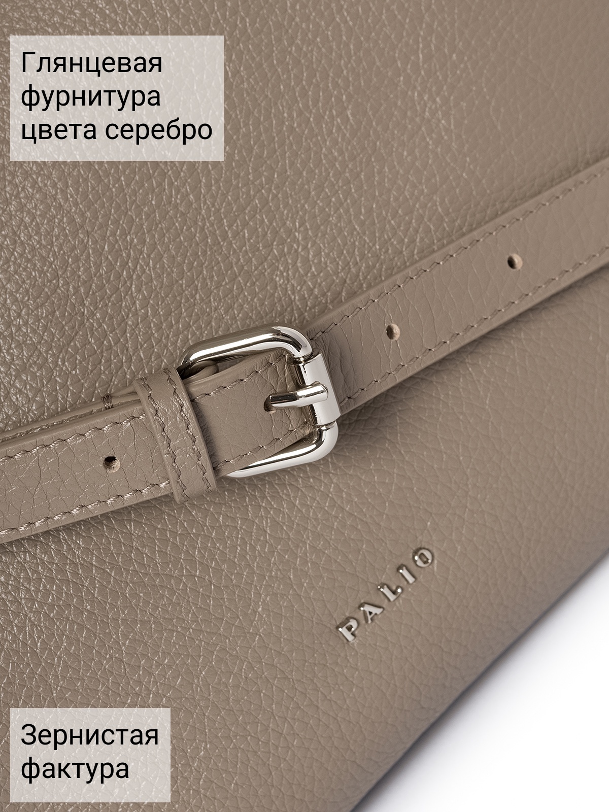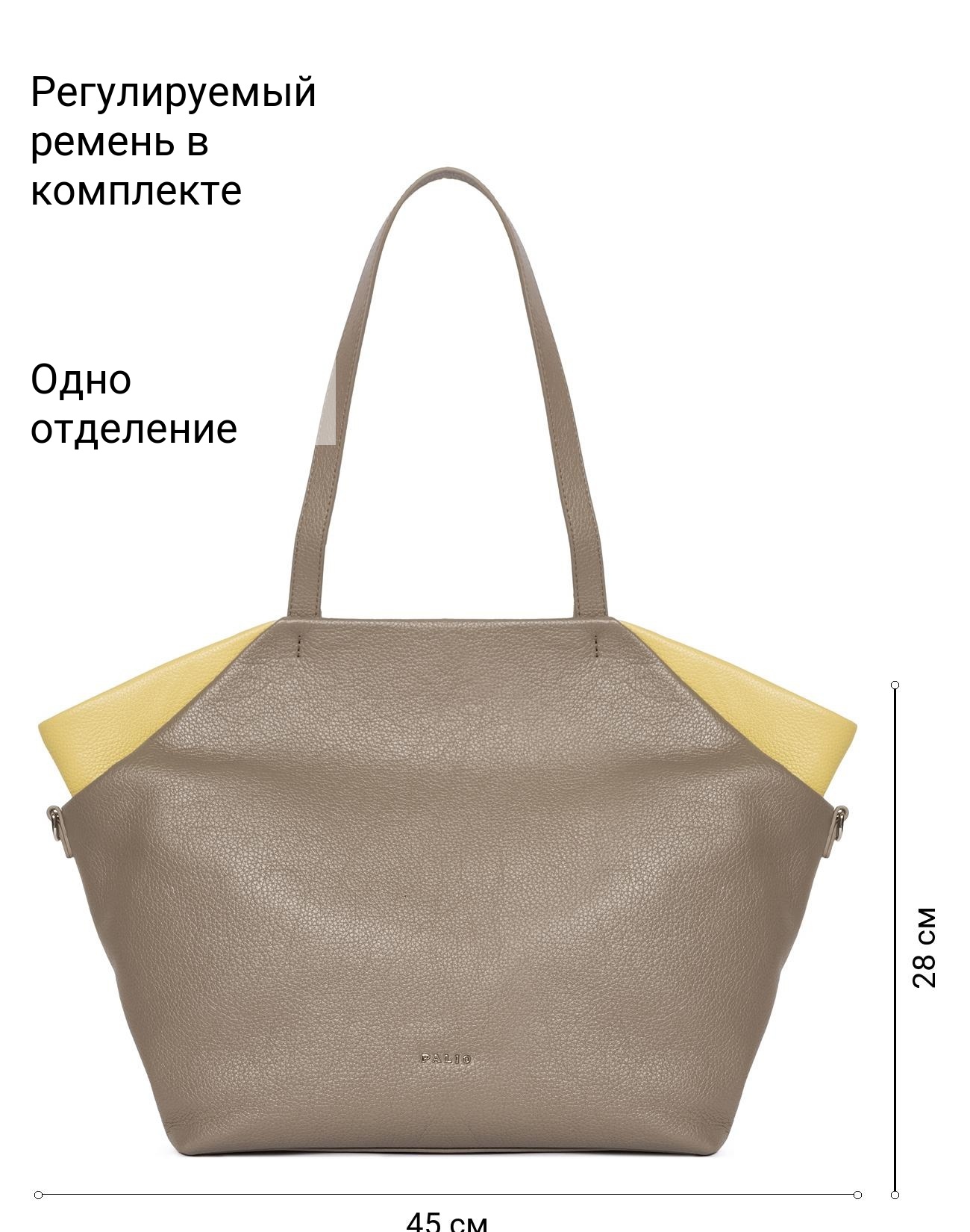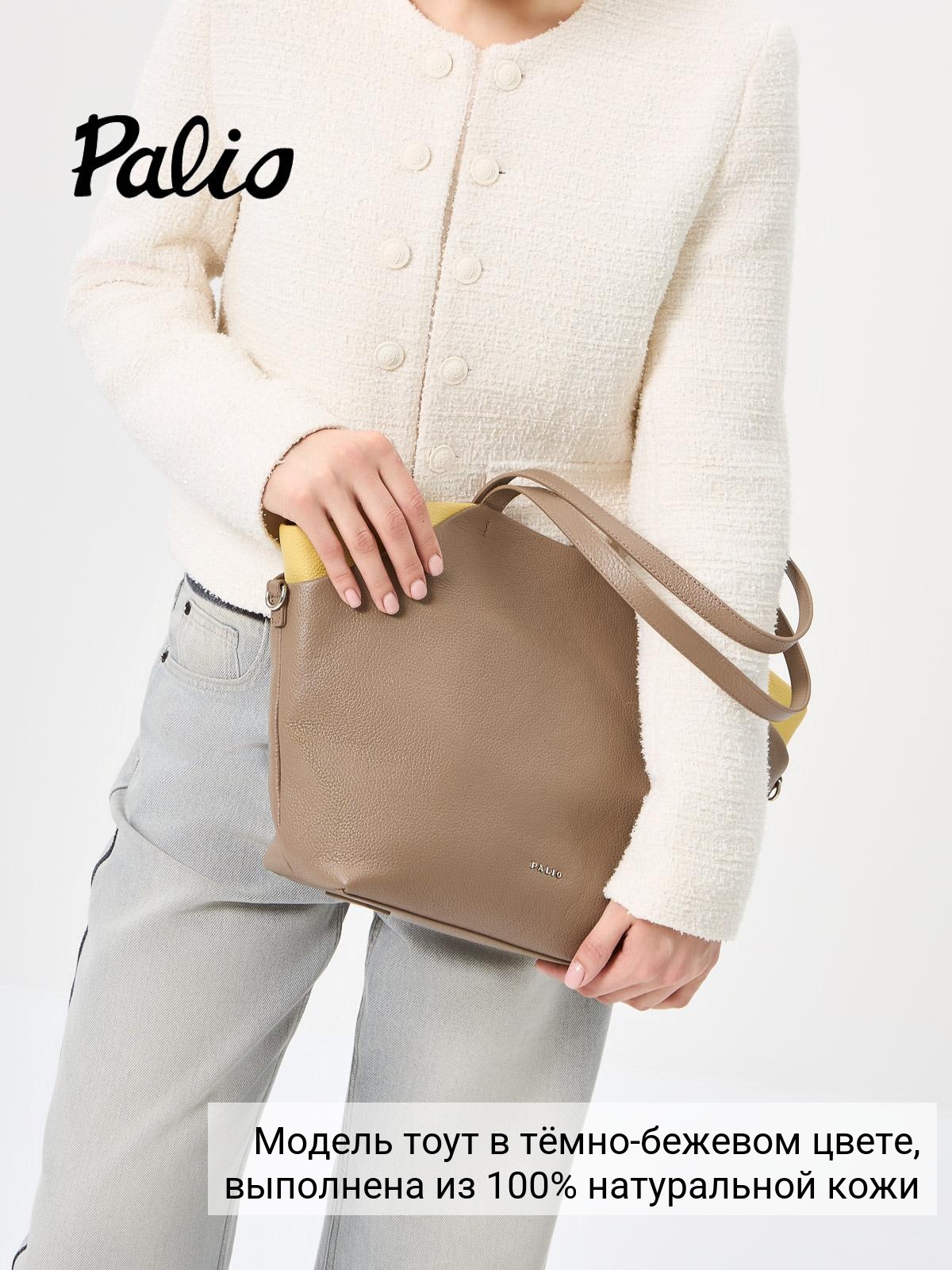 Женская сумка торговой марки Palio из натуральной кожи. Модель застегивается на молнию. Содержит внутри одно отделение в котором имеются карман на молнии и два открытых кармана. На задней стенке есть карман на молнии. Высота ручек - 23 см. Длина регулируемого съемного плечевого ремня из натуральной кожи - 94 см ширина - 15 см. Модель не имеет ножки на дне. Вмещает формат А4.