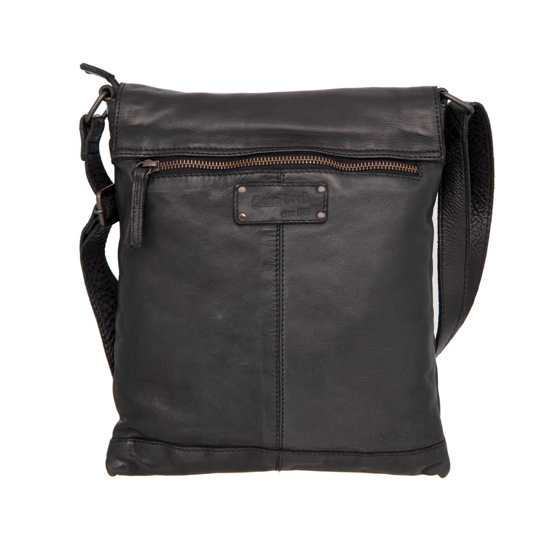 Мужской планшет в винтажном стиле от бренда Gianni Conti, выполнен из мягкой натуральной кожи чёрного цвета. Закрывается на молнию. Внутри одно вместительное отделение, карман для документов на молнии и два открытых кармашка. Снаружи на лицевой и внутренней сторонах карманы на молниях. Оснащён кожаным регулируемым плечевым ремнём. В комплекте мешок-пыльник. Размеры: 28 х 23 х 7 см.