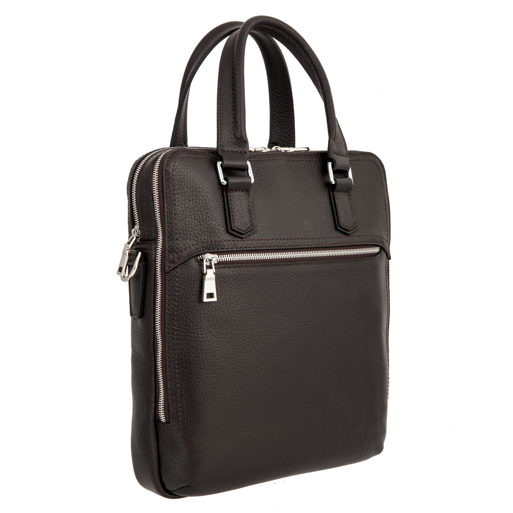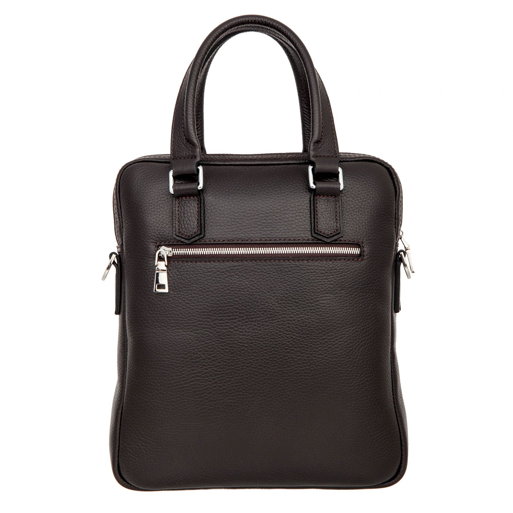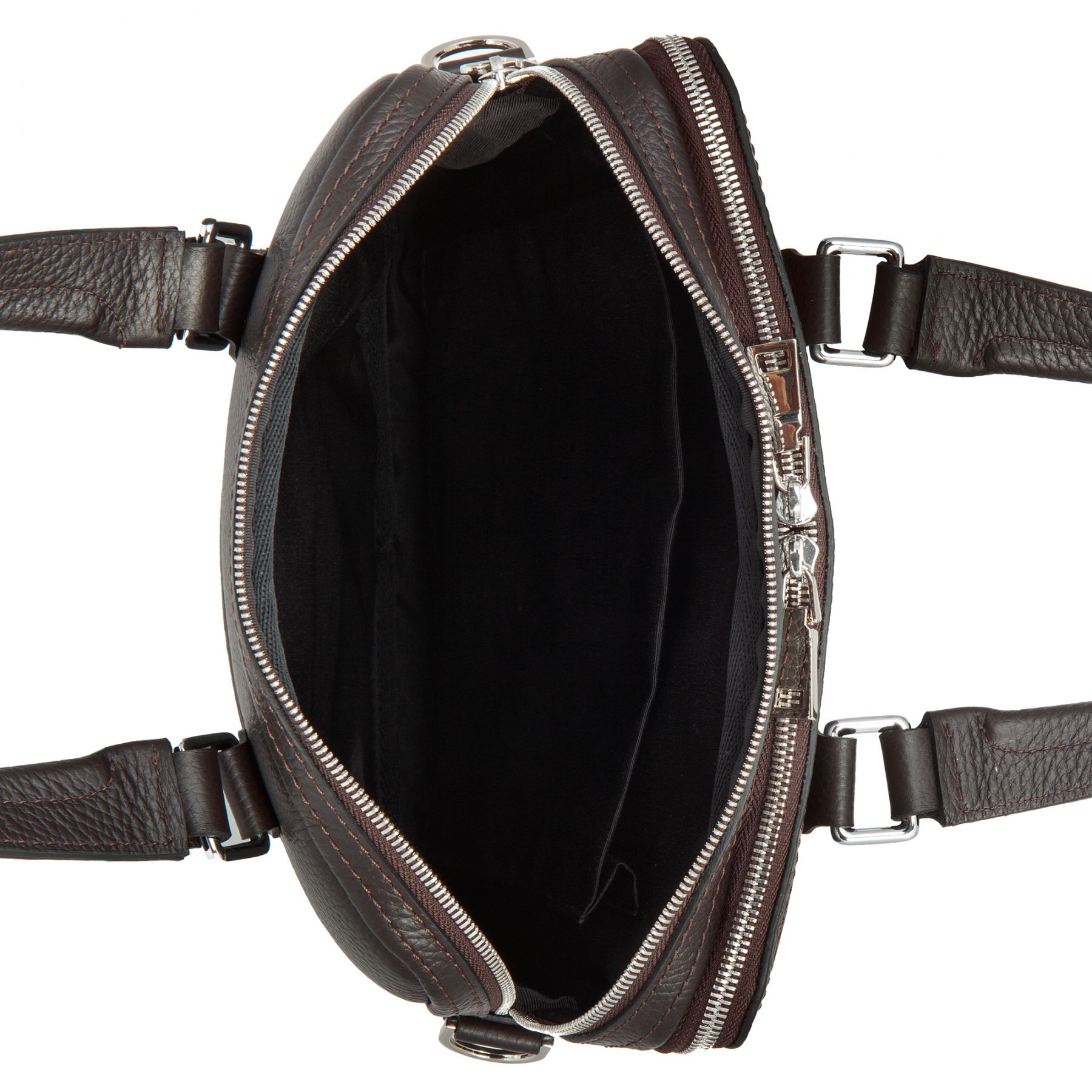 Мужская сумка коричневого цвета из мягкой натуральной кожи зернистой фактуры. Состоит из двух независимых отделений на молниях. Внутри карман на молнии, два кармашка для мелких предметов и отделение для планшета. Снаружи на лицевой и задней стенках карман на молнии. Планшет оснащён удобной верхней ручкой и съёмным регулируемым плечевым ремнём на карабинах. Цвет фурнитуры - серебро.