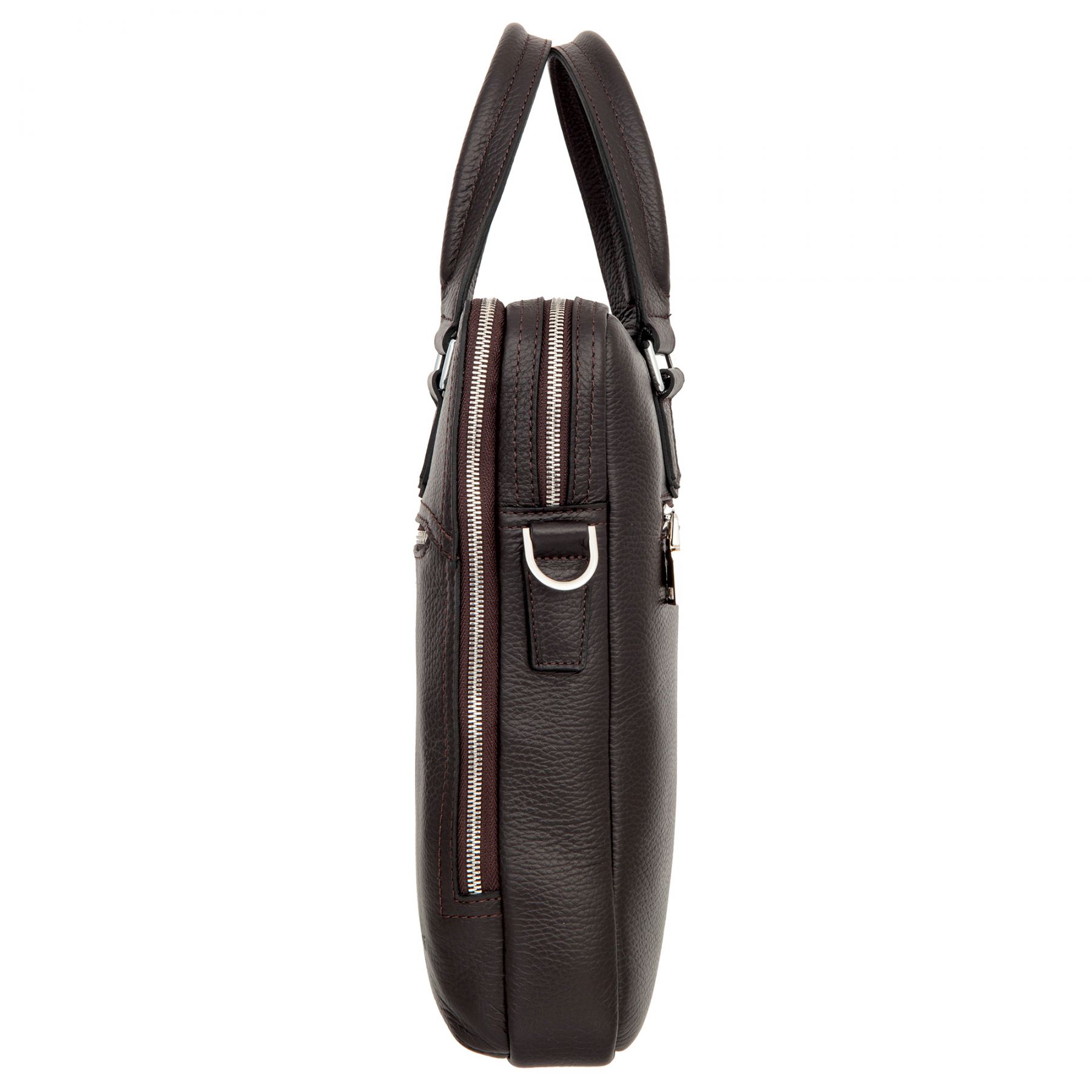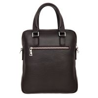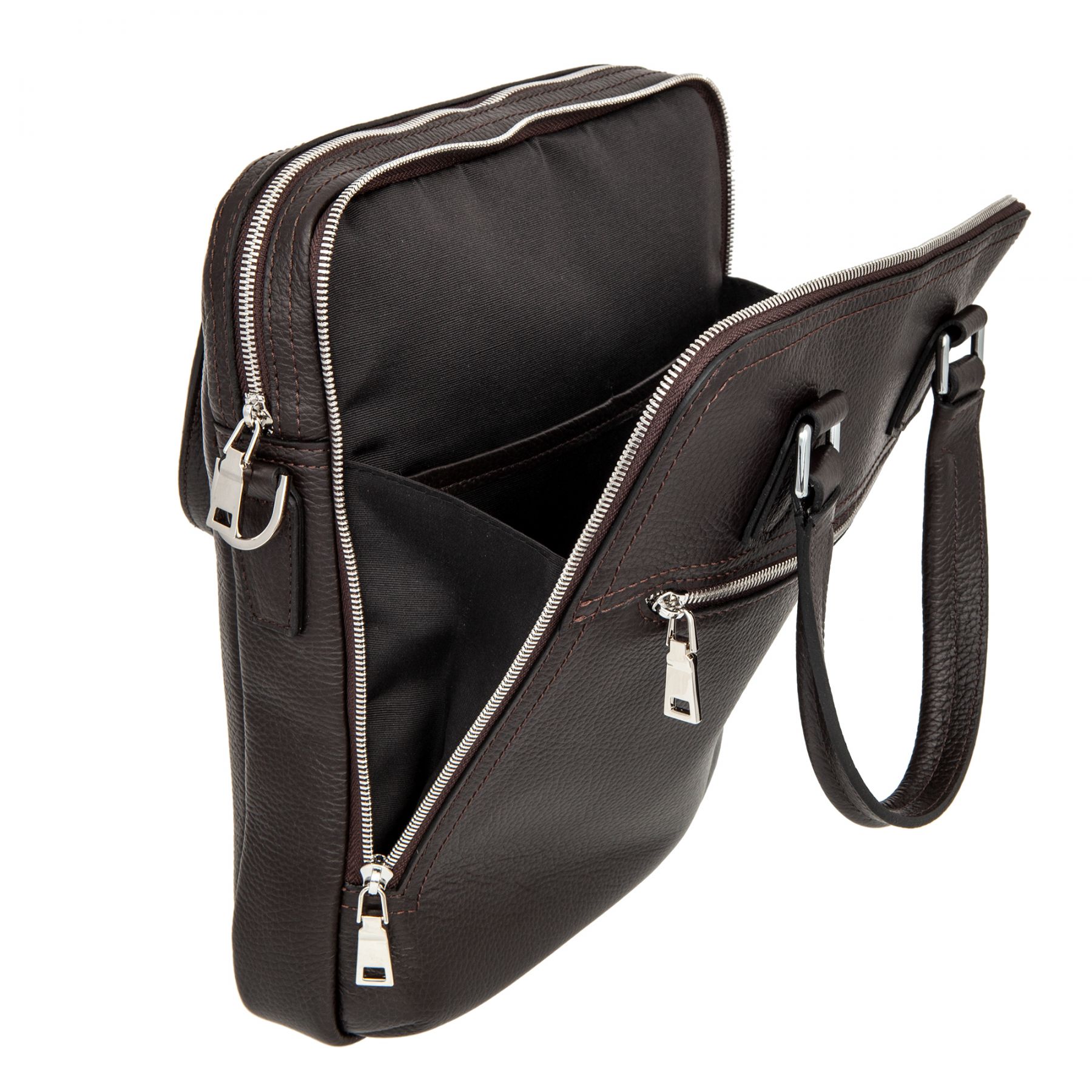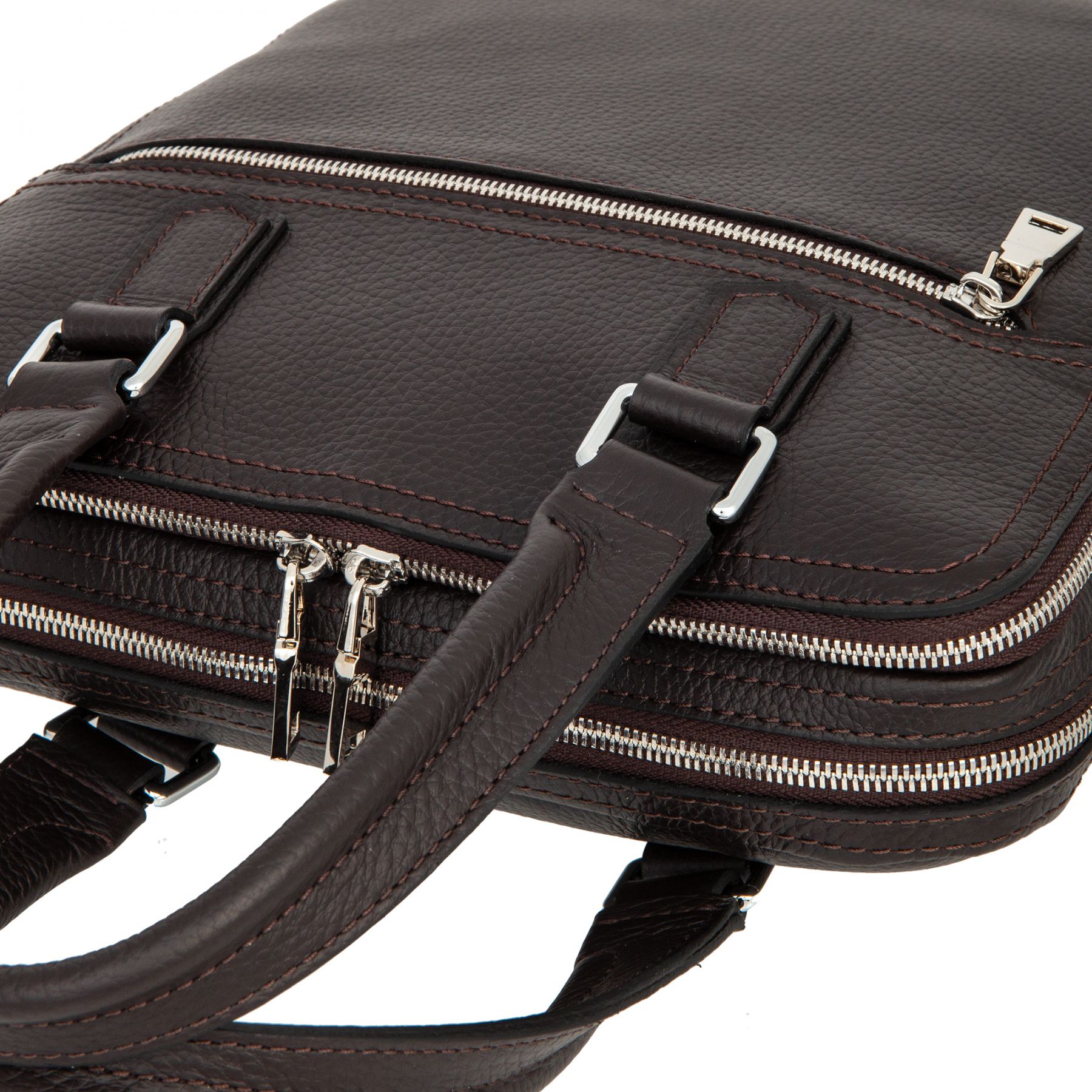 Мужская сумка коричневого цвета из мягкой натуральной кожи зернистой фактуры. Состоит из двух независимых отделений на молниях. Внутри карман на молнии, два кармашка для мелких предметов и отделение для планшета. Снаружи на лицевой и задней стенках карман на молнии. Планшет оснащён удобной верхней ручкой и съёмным регулируемым плечевым ремнём на карабинах. Цвет фурнитуры - серебро.