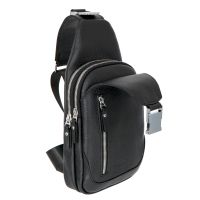 Сумка слинг через плечо черного цвета из натуральной кожи. Закрывается на автоматическую пряжку, внутри три отделения, два из которых закрываются на молнию. С внешней стороны на лицевой стенке отделение на молнии. Сумка оснащена регулируемым плечевым ремнём на карабинах.