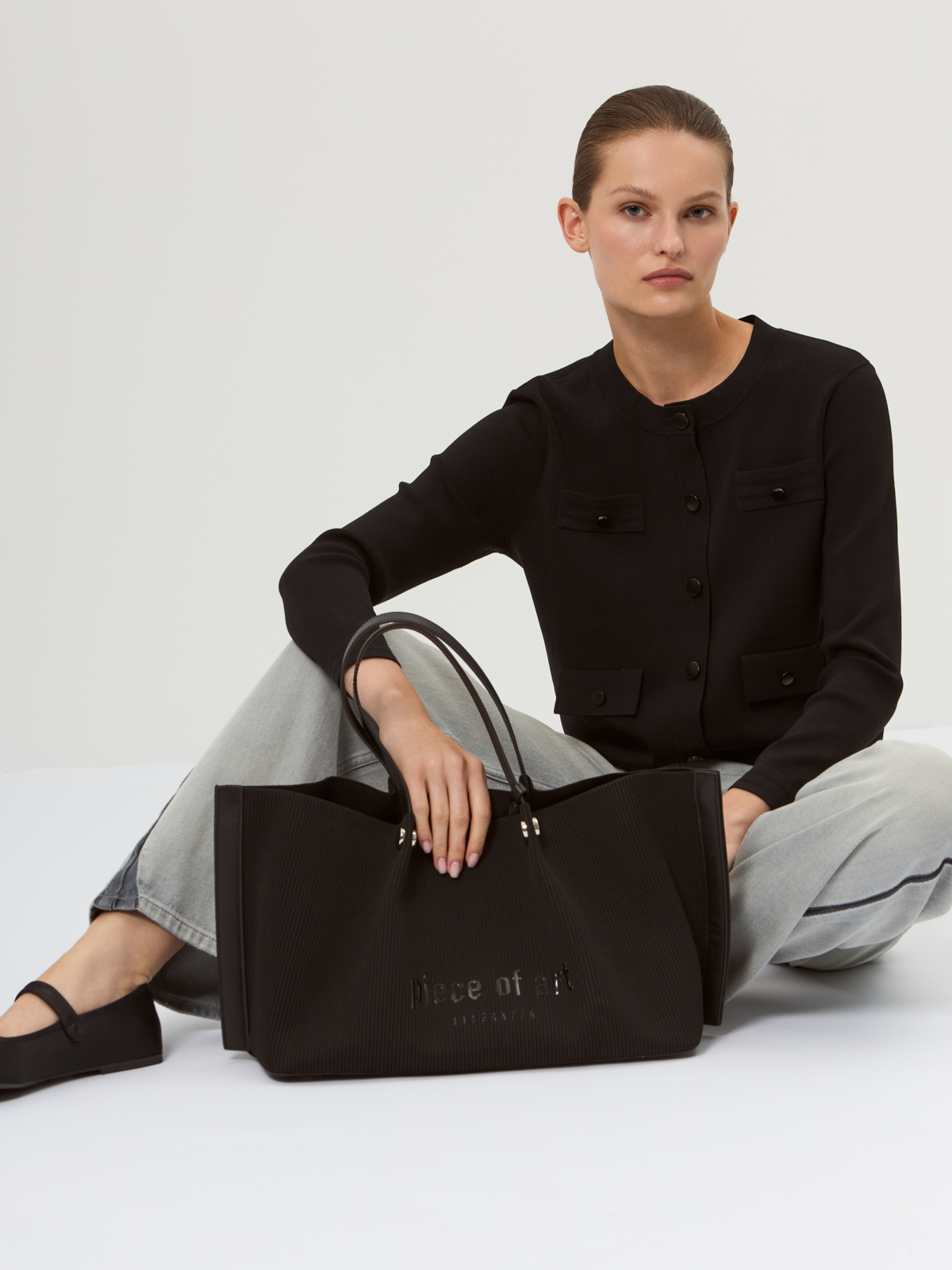 Женская сумка торговой марки Eleganzza из плотного износостойкого полиэстера с отделкой из натуральной кожи. На передней части сумки расположена силиконовая надпись Piece of Art" добавляющая стильный акцент. Объемная и легкая содержит внутри одно отделение с вкладной косметичкой. Косметичка застегивается на молнию. Высота ручек - 18 см. Длина регулируемого съемного плечевого ремня из текстиля - 112 см ширина - 4 см. Высота ручки - 15 см. Модель имеет ножки на дне. Вмещает формат А4."