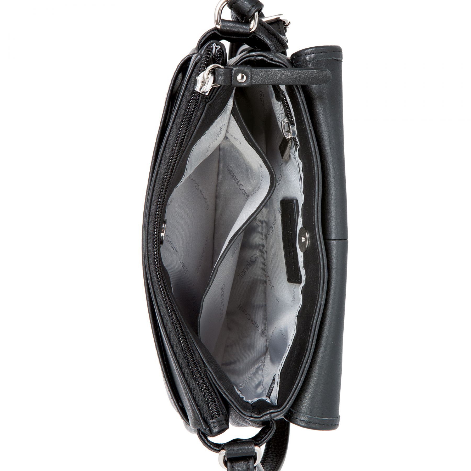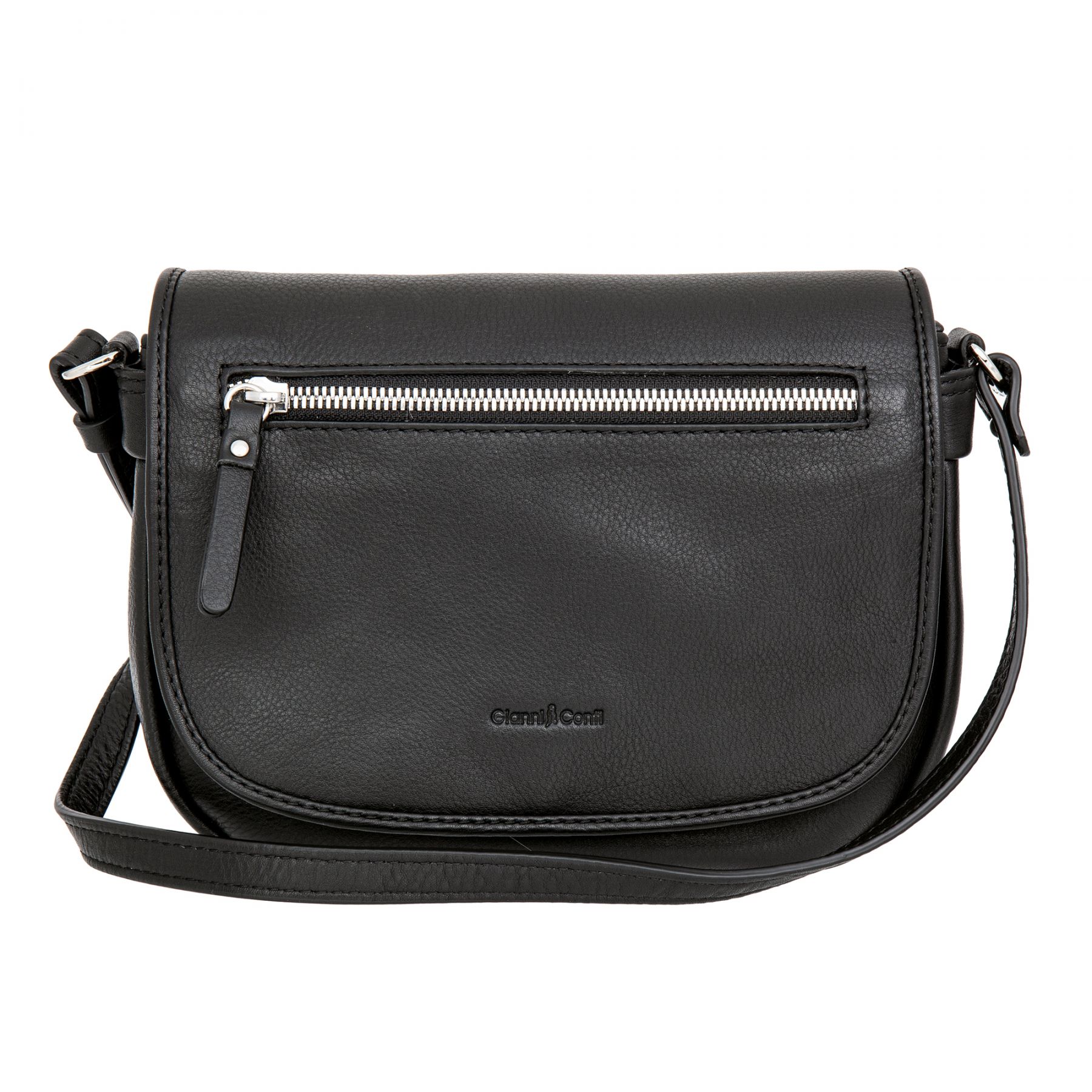 Женская сумка Gianni Conti из натуральной кожи зернистой фактуры. Имеет два отделения, одно из которых на кнопке, другое на молнии. В отделении на кнопке имеется внутренний карман на молнии и карман для мелких предметов. Сумка закрывается на клапан с кнопкой. Под клапаном имеется потайной карман, на самом клапане внутренний карман на молнии. На задней стороне сумки расположен дополнительный карман на молнии. Сумка оснащена регулируемым плечевым ремнем, выполненные из зернистой кожи. Сумка вмещает документы формата А5. Цвет фурнитуры – серебряный.